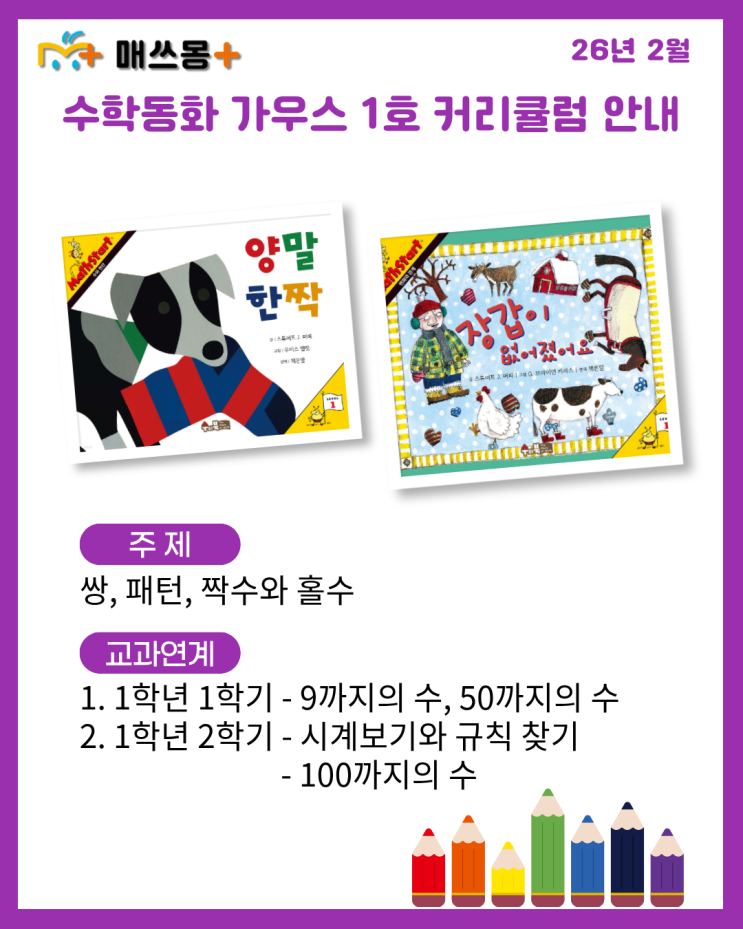 방학특강을 하고 있으니 시간이 정말 빠르게 흘러가네요~ 2월 송도매쓰몽플러스학원의 수학동화 수업을 소개하려고 합니다! 2월 부터는 수학동화 모든 과정이 오픈됩니다! 1. 가우스과정(목요일 4시30분) 2. 피보나치과정(월요일 4시40분) 3. 뉴턴과정(화요일 4시 40분 / 수요일 4시45분) 4. 오일러과정(수요일 4시40분) 5. 유클리드과정(토요일 1시) 송도수학학원 송도매쓰몽플러스학원 친구들의 2026년 2월 수업도서를 안내해 드립니다. 이번 달에 수업할 책들은 다음과 같습니다. 양말 한짝 / 장갑이 없어졌어요 '양말 한짝' 책에는 짝을 잃은 양말이 등장합니다. 짝을 잃은 양말이 짝을 찾아가는 내용이 나와요! 우리 친구들도 매....... <img src="https://blogthumb.pstatic.net/MjAyNjAxMzFfMjky/MDAxNzY5ODY0MTgzOTg2.75MBFuqW_45_adhYc3SEjqvw3QORlD5Lf6SLxbxtT1Ag.OfPqGuHw340xKZDBrN9ORAYXr5Zhxzg-r1SlUNtdHoQg.PNG/26%B3%E2_2%BF%F9_%281%29.png?type=s3" />