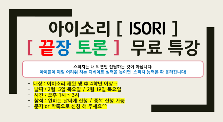 아이소리 스피치입니다~^^ 오늘 아이들과 특별수업 4주차로 [ 디베이트 - 스쿨존은 필요한가?] 라는 다소 쉬운 주제로 토론 수업을 하였습니다~ 아이들은 찬성편에 서서 논거와 예시를 조사하고 정리한 후 토론을 이어갔는데~~~~~~~~~ 아이들이 정말 많이 어려워하더락요~^^ 그래서 신학기 대비 겸 대강당 발표회 자신감 준비를 위해 2월 2번의 클리닉 수업을 진행하겠습니다~!! 클리닉 수업은 아이소리 회원들만을 위한 무료 특강수업입니다~^^ <img src="https://blogthumb.pstatic.net/MjAyNjAyMDFfNDIg/MDAxNzY5OTA3MDAwNzQx.rgiKyURzVd6gyDPclXrDHGa7rexWoCXRwR8A5B64Wzwg.RtL_-ybZf6R42Ih9Wal5BRgl4R7vzBx3QjMk9lnXC1og.PNG/202602_%C5%AC%B8%AE%B4%D0.png?type=s3" />
