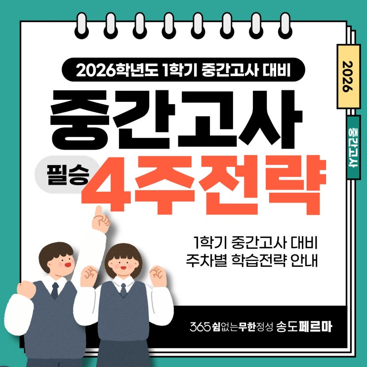 안녕하세요. 송도와 연수구지역 초등부터 고등까지, 주요과목을 중심으로 내신과 입시교육에 천착하고있는 송도페르마입니다. 다가오는 중간고사를 앞두고, 최근 이투스 교육평가연구소에서 제시한 4주 학습전략을 바탕으로 카드뉴스를 작성하여 공유하는 것과 함께 학원의 중간고사대비 수업 방향과 실제 준비 과정을 함께 안내드리려고 합니다. 단순한 시험 대비를 넘어, 이번 시험에서도 지난 성과를 이어가기 위한 준비가 어떻게 이루어지고 있는지 직접 보여드리도록하겠습니다. 그럼 먼저 최소 시험을 4주 남기고는 시작되어야할 오는 중간고사대비 학습방법을 송도페르마중등수학학원이 작성한 카드뉴스를 통해 주차별로 확인하시기바랍니....... <img src="https://blogthumb.pstatic.net/MjAyNjAzMjZfMTc1/MDAxNzc0NTIxNTgxNDEz.BCGfhxcUd0oQYO14q18BkGlUcuJCB5uDyvHA3khRQkwg.qHjPBv_z3eeGwBk0Q7zKTOrjoUbnzpBUkTQVurqjj8cg.JPEG/%BC%DB%B5%B5%C1%DF%B5%EE%BC%F6%C7%D0%C7%D0%BF%F81.jpg?type=s3" />