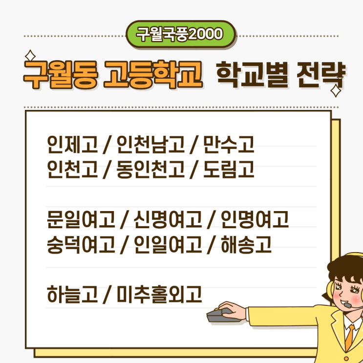 학교별 맞춤 전략, "우리는 학교를 알고 시험을 압니다" 이번 예비고등부 과정은 단순한 통합 수업이 아닙니다. 인근 10여 개 고등학교의 최근 3개년 기출 데이터를 분석하여, 학교별 '킬러 문항'과 '서술형 특징'을 완벽히 반영한 커리큘럼으로 운영됩니다. [반 편성 확정 학교 리스트] 남고 라인 : 인제고 / 인천남고 / 만수고 / 인천고 / 동인천고 / 도림고 / 강화고 여고 라인 : 문일여고 / 신명여고 / 인명여고 / 숭덕여고 / 인일여고 / 해송고 특목·자사고 라인 : 하늘고 / 미추홀외고 구월국풍2000만의 '압도적' 관리 시스템 단순히 강의만 듣고 가는 학원은 성적을 바꿀 수 없습니다. 구월국풍....... <img src="https://blogthumb.pstatic.net/MjAyNjAyMDVfMTI0/MDAxNzcwMjYyNzgzMDUz.riPpsxfrsmKnU34pBxRKcuipnHrYLVjzUpgCUywq1bEg.mjs0LKSgTgMKjghXbVB3CxKRNh6UjFV-paiYJ5Vjs0Mg.PNG/%C1%A6%B8%F1%C0%BB_%C0%D4%B7%C2%C7%D8%C1%D6%BC%BC%BF%E4._%2820%29.png?type=s3" />