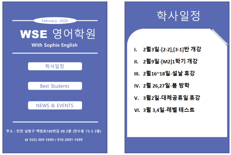 안녕하세요. 2026년 2월입니다. 2월에는 설날이 있습니다. 가족들과 즐겁고 행복한 명절 보내세요~~~ 2월에는 설날도 있고 많은 학생들의 학년이 변경됩니다. 졸업과 입학이 초,중, 고등학생들에게 있는 시기이니 가족들과 즐겁게 잘 보내시고 새학기를 맞이하길 바랍니다. 1월에는 앵커듣기 100% 수행자가 많습니다. 70% 미만 수행자도 몇 명 안되는~~ 정말... 놀라운 달이였습니다. 신년 맞이 이벤트에 적극적인 참여 부탁드려요. 이벤트 관련 궁금하신 부분은 문자나 톡 주시면 답변 가능할 때 연락드립니다. 제가 수업하는 원장이라... 수업 중에는 전화가 어렵습니다. 작년부터 A,B형 독감, 감기등 ...전염성 질병에 많은 학생들이 수업에 부....... <img src="https://blogthumb.pstatic.net/MjAyNjAyMDVfMTQz/MDAxNzcwMjcwMDYxODcz.MD0r2X_SSNPb3dsApryLi59fagfvKQZI2Ev274AUDV4g.-el8t9EM1vxOvWyJXsj_Z-EVUhNZ9S-1F2omLtD9a6wg.PNG/image.png?type=s3" />
