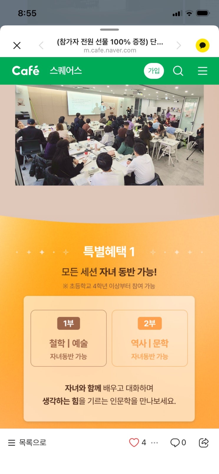 상상스퀘어에서 만난 ‘우리 집 인문학’ 특별 강연 후기 토요일, 상상스퀘어에서 진행된 ‘우리 집 인문학’ 특별 강연에 다녀왔습니다. 오전 10시부터 12시, 그리고 점심 이후 오후 2시부터 4시까지— 하루를 온전히 ‘공부’에 투자한 시간이었습니다. 이번 강연은 단순한 지식 전달을 넘어, 아이들의 생각을 어떻게 키워줄 것인가에 대한 깊은 고민과 방향을 제시해주는 자리였습니다. 역시 ✔ 책은 “읽는 것’에서 끝나는 것이 아니라 ✔ 질문하고, 나누고, 글로 표현하는 과정이 아이의 사고력을 얼마나 크게 확장시키는가에 있다. 아울러 아이의 공부는 결국 ‘얼마나 많이 아느냐’가 아니라 얼마나 깊이 생각하느냐라는 점이었습니다. ....... <img src="https://blogthumb.pstatic.net/MjAyNjA0MDRfMTA2/MDAxNzc1Mjk2NjAwMDkw.LYircbAVnbpDDXr5pAyBFnIEWovA9rgc8xcJ8CVVLAEg.8njANqa9cxnSmjKNuLU_zDzRU__9y0Jfrr73kfMh7-Ig.JPEG/IMG%A3%DF2819.jpg?type=s3" />