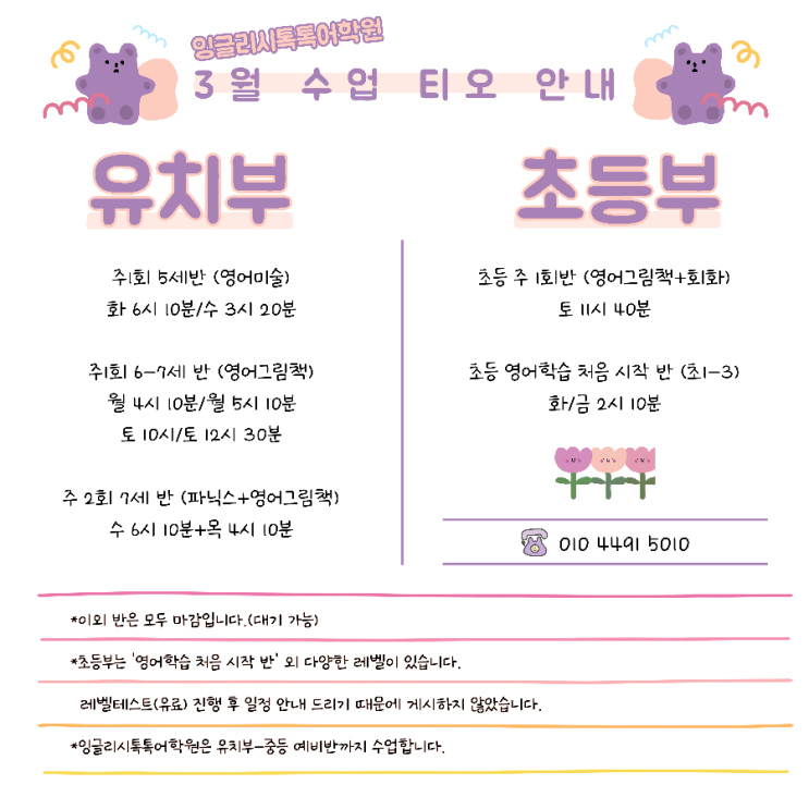 -초등 영어학습 처음 시작반은 4반 중 3반이 정원 마감입니다. 위의 시간표에 딱 세 자리만 남아있습니다. -초등1학년-예비중등반까지 신설반 외 기존 반들은 레벨 테스트 후 자세한 일정 안내드릴 수 있습니다. -안내드린 반은 각각 티오 1-3명 정도 남은 반들입니다. -전화 상담 요청하시면 상세하게 안내 드릴 수 있습니다. #잉글리시톡톡어학원 #산곡동영어학원 <img src="https://blogthumb.pstatic.net/MjAyNjAyMDNfMTAw/MDAxNzcwMTA1MjMwNjA2.zCOQp6XwPPaKDOZTb-dL8G6yhctEqk3E8u-n7xVf5Lsg.V32MLDWxL7u7TcDsxtXFC70O3MzIf_gJqDd2-K6Z3j0g.PNG/900%A3%DF1770104701267.png?type=s3" />