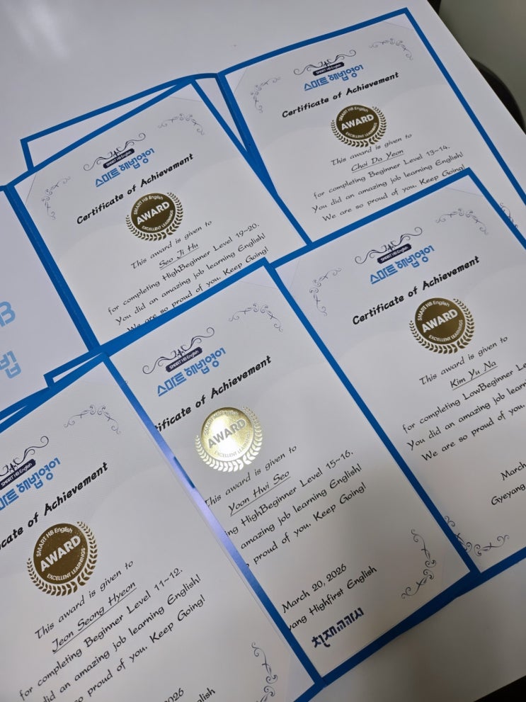 초등학생들에게 영어학습의 성취감을 어떻게 더 줄 수 있을까 고민하다가 열심히 배우고 도전하며 한 단계 더 성장한 것을 격려하고 축하하기 위해 상장을 주게 되었습니다^^ 받은 학생들은 너~무 뿌듯해합니다!! (사진찍을 때 표정은,,,,>.<) 못 받은 학생들도,, 다음에는 꼭 받을거라며 열심히 본인 학습에 임하는 모습이 너무 예쁘고 멋졌습니다!! Level Up하면 받게 될 상장~ 모두가 상장의 주인공이 될 수 있습니다!! https://open.kakao.com/o/s85GJtRh 상담문의 : 초등 252-0582 / 중고등 556-0306 <img src="https://blogthumb.pstatic.net/MjAyNjAzMjNfMTE0/MDAxNzc0MjQxMzA2Njc5.rD3RM34-SUwtti5kLNjlx84onaV8_qGxC8wfL7zaQSgg.3jKIyoJij9-QbSHeG4YQLM73ghyCIKxhBGHKavMTVr0g.JPEG/KakaoTalk_20260323_134138378.jpg?type=s3" />