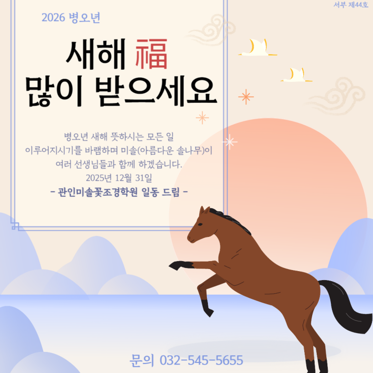 #2026 #병오년 #새해인사 #새해 #일출 #새해소망 #행복 #기원 #조경학원 #국비학원 #국비지원 #인천조경학원 #관인미솔꽃조경학원 #산림학원 #인천산림학원 #조경기사 #과정평가형 #조경기능사 #산림기능사 #종자기능사 #도시농업관리사 #환경기능사 #산업안전기사 #필기 #실기 #시험 #자격증 #취득 #취업 #준비 #도전 #시작 #새출발 <img src="https://blogthumb.pstatic.net/MjAyNTEyMzBfMjc3/MDAxNzY3MDc5NTQxNTAy.-CMfBD0vVDs0RW7yCFZkeOiTsrBH5erygktZM8DFU6Mg.ToP9QKVj3wPbxoc_77nuEf5dvThpP1DJHl6LhYOCVgYg.PNG/%C1%A6%B8%F1%C0%BB_%C0%D4%B7%C2%C7%D8%C1%D6%BC%BC%BF%E4_-001_%2876%29.png?type=s3" />