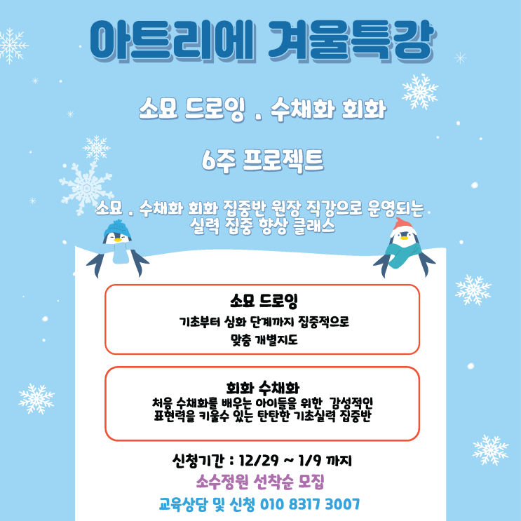 [아트리에 미술학원] 겨울특강 안내 / 겨울방학 / 소묘 드로잉 / 수채화 회화 / 소수정예