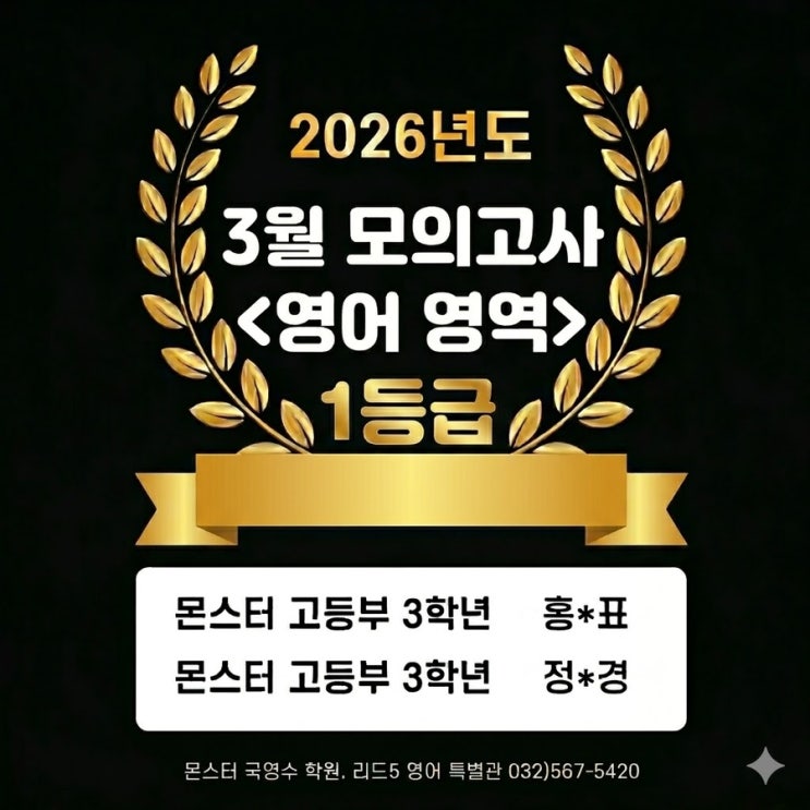 고등학교 3학년! 긴장되는 3월 모의고사에서도 실력 발휘한 몬스터의 학생들 안녕하세요. 초등, 중등, 고등 교과 특목고, 해외 대학 입시 전문 청라 수학, 영어 학원 몬스터 국영수입니다. 봄기운에 마음 설레는 3월 말이지만 우리 고3 학생들에게는 긴장감 가득한 첫 모의고사 시즌이 찾아왔습니다! 난도 높았던 2026 3월 모의고사 이번 2026학년도 고3 3월 모의고사는 작년 수능의 기조를 이어받아 수험생들에게 상당한 압박감을 주었는데요! 지문의 소재가 생소하고 문장 구조가 복잡해지면서, 단순 암기 위주로 공부했던 학생들에게는 체감 난도가 유독 높았던 시험이었습니다. 몬스터 국영수 영어 1등급 2명 배출! 이....... <img src="https://blogthumb.pstatic.net/MjAyNjAzMjVfMjk1/MDAxNzc0NDM5NTA5MTAw.uise6KJ6v2KV8_5uZXn2OVFmpDLAZwL-oysHHuAkgYMg.KVRtRRIF_bjaMFVPAKOaiL_M3lensyRiOTmjRqV2Vt0g.JPEG/IMG%A3%DF3059.JPG?type=s3" />