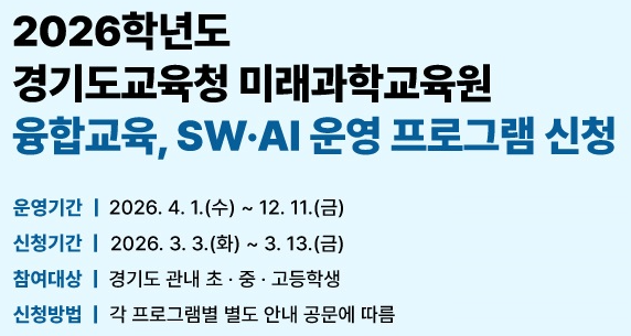 경기도교육청미래과학교육원에서는 경기도 관내 초·중·고등학생 및 특수학교 학생들을 대상으로 창의적인 융합 인재 양성을 위한 '2026학년도 융합교육 및 SW·AI 프로그램'을 운영한다고 해서 소식을 가져왔습니다. 학생들의 상상력과 탐구 역량을 키워줄 다양한 체험 프로그램이 준비되어 있다고 하니 관심있는 분들은 신청해 보시면 좋을 것 같습니다. 운영 및 신청 안내운영 기간 2026년 4월 1일(수) ~ 12월 11일(금) (※ 프로그램별로 일정이 다를 수 있습니다) 신청 기간 : 2026년 3월 3일(화) ~ 3월 13일(금) 참여 대상 : 경기도 관내 초·중·고등학생 및 특수학교 학생 신청 방법 : 각 프로그램별 별도 안내 공문 참조 주요....... <img src="https://blogthumb.pstatic.net/MjAyNjAzMDVfMTM2/MDAxNzcyNzAyNjg1NDcz.l2P2g5WwTAzhnEi8vA1c-73oO0ke4jDIjCsSkMt4-tQg.veUoxsGygVoz1p74vbgqoobeTm_Ctq9G8J1KRDtTvnYg.PNG/image.png?type=s3" />