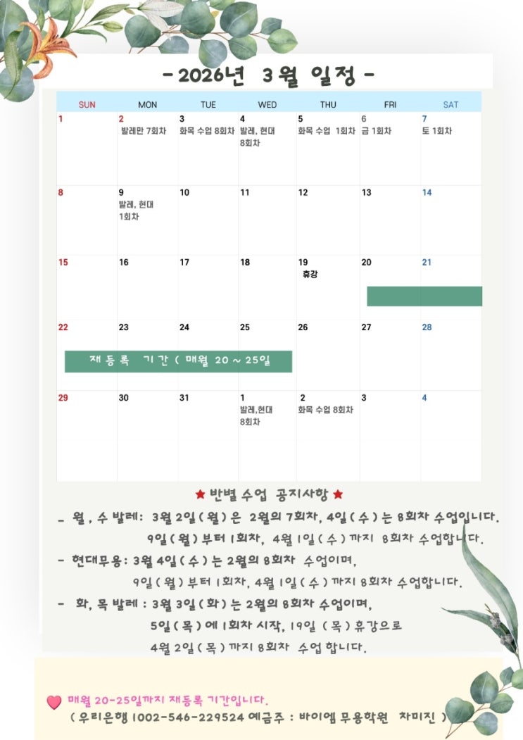 [유리엘 발레]을지로점 3월 시간표 시청/충무로/동대문/명동