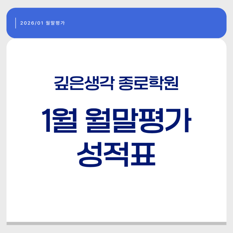 안녕하세요! 깊은생각 종로학원입니다! 지난 1월 28일과 29일, 월말이 된 시기에 맞춰 시기별, 학년별 학생들의 이해도와 성취도를 파악하기 위해 저희 학원에서는 1월 월말평가를 진행했습니다! 시험 개요 시험 대상 : 초중고 전학년 시험 범위 : 각 예비학년 1단원 문항수 : 30문항 시험 시간 : 45분 (학생들의 성취도 확인 및 점검을 위해 각 학년별 동일한 시험지로 진행했습니다!) 다들 온 집중을 다 해 고민하고 고뇌하며 문제들을 풀어나갔답니다 :) (멋지다! 우리 학생들!) 모든 학생들이 시험을 마치고 선생님들이 열심히 채점하고 분석하여 학생들의 결과를 담은 성적표까지 출력 완료했습니다! 위와 같은 내용들....... <img src="https://blogthumb.pstatic.net/MjAyNjAyMTFfMjEx/MDAxNzcwNzgyNDgxNDMx.CZ8YFJJa5UTlUURxn2Vi8hThk_0Ki85qVipbyTorcI4g.Bes3cMmw9sfdBmU7qkVuXgU-zRxDVLW7NyvuSqVqGJsg.PNG/2.png?type=s3" />