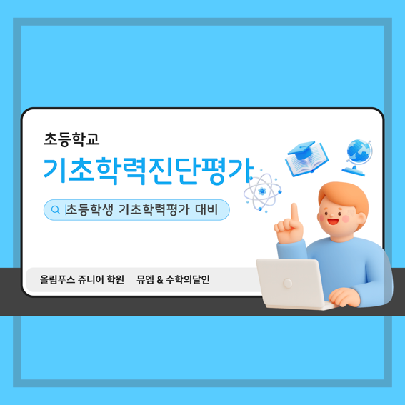안녕하세요 올림푸스 쥬니어 학원 뮤엠&수학의 달인입니다. 새 학기가 시작되면 초등학교에서는 기초학력 진단평가를 실시합니다. 처음 접하는 학부모님들께서는 “시험인가요?” “점수가 낮으면 어떡하죠?” 이런 걱정을 하시기도 합니다. 하지만 기초학력 진단평가의 의미를 알고 나면 조금 다른 시선으로 보이실 거예요. 오늘은 기초학력 진단평가에 대한 가이드를 정리해 드리려고 합니다 초등학교 기초학력 진단평가, 무엇이고 어떻게 준비할까요? 기초학력 진단평가란 무엇인가요? 기초학력 진단평가는 학년과 수준에 맞는 기본적인 학습 내용을 우리 아이가 얼마나 이해하고 있는지 확인하는 평가입니다. '시험'이라....... <img src="https://blogthumb.pstatic.net/MjAyNjAzMDZfMTY4/MDAxNzcyNzc4Njc5Njky.EvA477HSEiLwS3_DtfmaL4rQf6BD4mdmuolMIhlTrcQg.2eDFGG5zYhISd3HUnT4RgY1nO6XmhGE_GEY4RGazGSYg.PNG/%B1%E2%C3%CA%C7%D0%B7%C2.001.png?type=s3" />