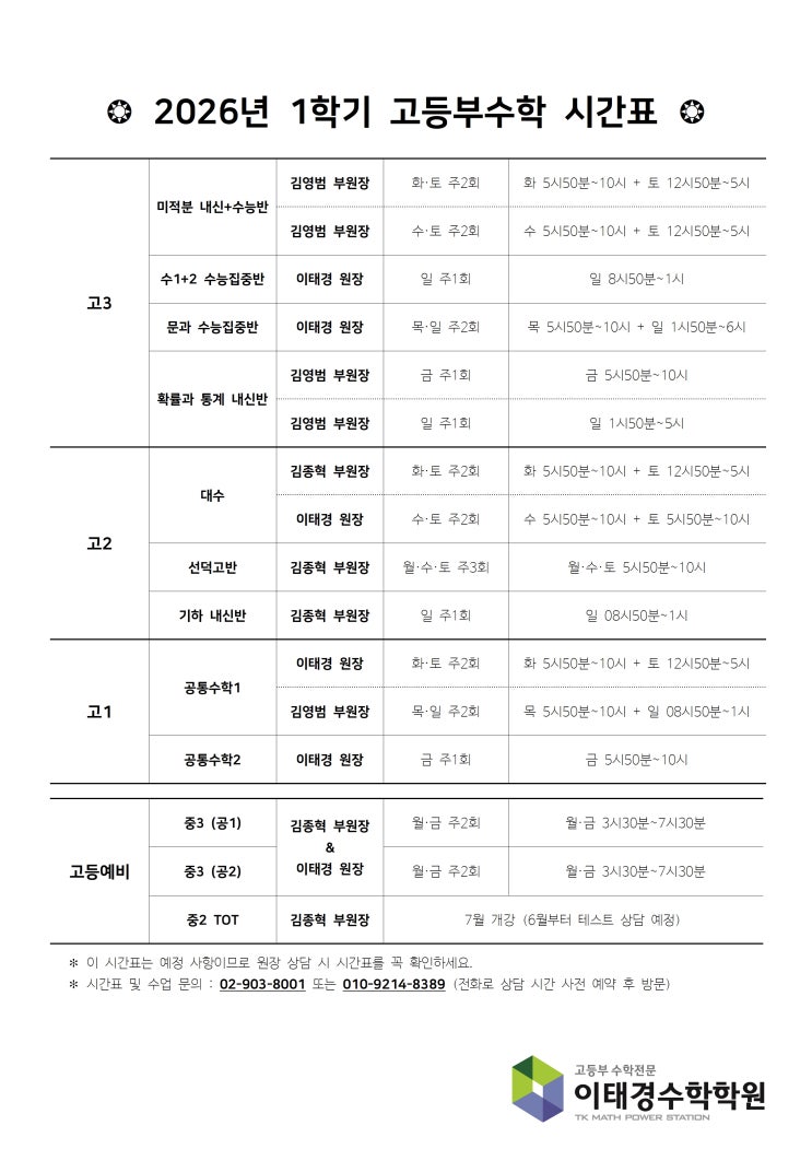 이태경원장입니다. 2026년 1학기 이태경수학학원 시간표를 공지해드립니다. 입학상담을 희망하시는 분은 먼저 전화로 시간 약속을 하신 뒤, 학생과 학부모님께서 함께 방문해주시면 됩니다. 02-903-8001 / 010-9214-8389 <img src="https://blogthumb.pstatic.net/MjAyNjAzMDNfNzgg/MDAxNzcyNTIzMTQ1NzE0.gStFjDItcwKfte1BPTeOlcWTSGH3kKFuZGKWOAgT6jMg.AAznxdioCRM2CmfVkiu_o0GF-jP_1Au9I8SkGJG1JZUg.JPEG/2026_1%C7%D0%B1%E2_%BD%C3%B0%A3%C7%A5001.jpg?type=s3" />