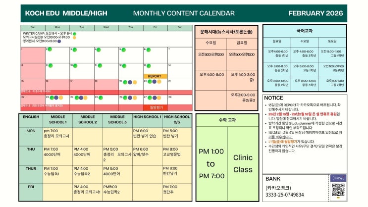 안녕하세요, KOCH EDU입니다! 어느덧 2월을 앞두고 우리 아이들의 학습 흐름을 이어가기 위한 2월 월간 일정(Monthly Content Calendar)을 안내해 드립니다. 초등부와 중고등부의 일정이 상이하니 아래 내용을 꼭 확인해 주세요. 1. 설날 연휴 휴원 안내 민족 대명절 설날을 맞아 휴원 일정이 있습니다. 가족들과 행복한 시간 보내시기 바랍니다. • 2월 16일(월) ~ 18일(수) 휴원 2. 주요 행사 및 평가 일정 • REPORT 배부: 2월 13일(금)에 한 달간의 학습 성과를 담은 레포트가 배부됩니다. 중고등부는 카카오톡으로 전달될 예정입니다. • GAME DAY (초등부): 2월 13일(금), 명절을 맞아 즐거운 게임 데이를 진행합니다. • 월말 평....... <img src="https://blogthumb.pstatic.net/MjAyNjAxMjZfMTIg/MDAxNzY5NDM4ODY4MDAw.G4NOGvtlBY1RWi8cckta2J8hOVPCvIbzfeIubBtFzdYg.9Vkd07WPmq1NZsSb_6N36r9UjC4YaBQnhIfnccSqP8wg.JPEG/KOCH_EDU_MIDDLEHIGH.jpg?type=s3" />