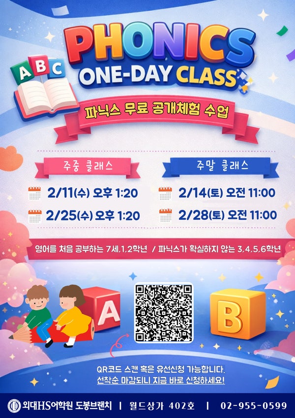 [ 엄마 아빠와 함께하는 파닉스 무료 공개체험 수업 ] 영어의 기초인 파닉스를 즐겁게 배우는 가족 참여 체험 수업에 초대합니다 :) 영어를 처음 시작하는 학생들에게 놀이와 체험을 통해 자연스럽게 영어의 기초를 다질 수 있는 특별한 시간입니다. 주중 클래스 -2월 11일(수) 오후 1:20 -2/25(수) 오후 1:20 주말 클래스 -2/14(토) 오전 11:00 -2/28(토) 오전 11:00 ※사전예약 필수※ https://forms.gle/JN6t5fg1ZLkNb35BA 3월 파닉스 개강 전, 체험수업 예약과 신규반 등록 지금부터 선착순으로 받겠습니다. 소리로 듣고 말하면서 배우는 기초 파닉스 수업 아이의 영어 자신감을 키우는 특별한 체험 기회 놓치지 마세요! #도봉구7세....... <img src="https://blogthumb.pstatic.net/MjAyNjAxMjdfOTkg/MDAxNzY5NTExNTc3MTgx.ka0I81NkV1BwWUdeWW9ImO_sZNHQgwXaOA39AbaNPhMg.fT3l4qXWYx8aHcipTvSjMPsfyKSNeR06C0zE9eVzV1Eg.JPEG/%B1%A4%B0%ED-004.jpg?type=s3" />
