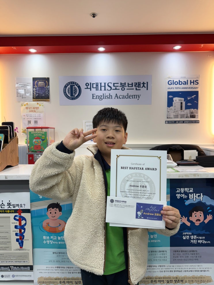 * Best HAFStar란 ❓ 외대HS도봉브랜치에서는 아이들이 올바르게 성장하며 똑똑해지는 기쁨을 느낄 수 있게 하는 것을 목표로 성적뿐만 아니라 수업 태도, 예의, 친구와의 관계까지 고려하며 매 세션마다 가장 모범적인 학생들을 선생님들께서 직접 베스트 합스타로 선정합니다⭐ [ 2026 January-February Best HAFStars ] Leo, Andrew, Tinabell Ian, William Michelle 원장님 Pick Montana반 Andrew 윤성이는 최근 원서리딩 챌린지에 깊이 몰입하여 수업이 끝난 후에도 스스로 남아 독서를 할만큼 배움에 대한 열의가 뛰어나며, 그 노력의 결실로 이번에 총 50권의 영어 원서를 완독하는 값진 성과를 이루었습니다. 독서량이 꾸준히 쌓이면....... <img src="https://blogthumb.pstatic.net/MjAyNjAzMDVfMjUy/MDAxNzcyNzAxMzE3Njc0.CVHFOZHTIRAo-KEGgwSiJxM6o9JI8LKen2Vb9PSWMJkg.LkVRpE8Fa6afnEA9FzDSr8L9yMRXuV97FDH9_I66twEg.JPEG/%C1%B6%C0%B1%BC%BA_%C7%D5%BD%BA%C5%B8.jpg?type=s3" />