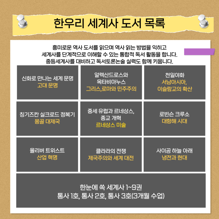 한우리는 4~6학년까지 통합사회 프로그램이 있습니다. 4학년은 한국사, 5학년은 세계 문화 지리, 6학년은 세계사로 진행됩니다. 6학년은 세계사 필독서를 읽고 시대적 배경을 알고 세계사의 큰 흐름을 이해할 수 있어요. 한달 4차시 프로그램으로 진행되며 필독서3권과 토론 1차시 구성입니다. 첫 차시는 세계사 필독서, 2차시는 문학 도서, 3차시는 토의 토론, 4차시는 교과관련 비문학 도서를 읽습니다. 이번달은 세 번째 세계사 책으로 이슬람 사회의 문화가 담긴 <천일야화>를 배웁니다. 천일야화 는 '천 일 하고도 하루 동안 밤마다 들려주었던 이야기'라는 뜻으로 아바스 왕조 때에 아랍 지역에 떠돌던 옛이야기를 모은 책....... <img src="https://blogthumb.pstatic.net/MjAyNjAzMDhfMTQy/MDAxNzcyOTc1NTE1NzI1.yhol56jTGvga3E0EXxL9paLshlnCf4SIfv4c2jb7uw8g.AWgx1cgyqAHS_tN3-P4F9bQostdbmTML9Im0i-IOcTcg.PNG/%BC%BC%B0%E8%BB%E7%B8%F1%B7%CF-003.png?type=s3" />
