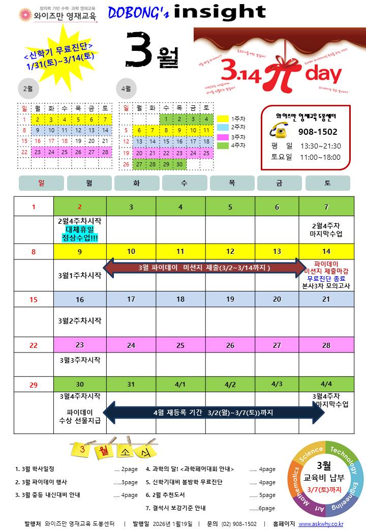 얼마전까지는 엄청 추웠는데 이제 봄 기운이 완연한것 같아요. 3월은 신학기 시작으로 마음도 몸도 바쁜시기입니다. 방학동안에 느슨해진 생활 습관을 바로 잡아 학교 생활을 준비해야 해요~~ 3월 와이즈만 도봉센터 소식지 안내드릴게요 ^^ 3월 수업은 3/9(월)~ 4/4(토)까지입니다. 3/2(월) 대체공휴일 정상 수업이예요^^ <3.14 파이데이~~~> 3월 14일 화이트데이 ?? nono 아니죠 수학 좀 한다는 우리들에게는 원주률을 기념하기 위한 파이데이 두둥 다섯가지 미션을 수행하고, 푸짐한 선물을 받으세요. 4월은 과학의 달이예요~~ 와이즈만 도봉센터에서는 과학의 달을 위한 여러가지 특강을 준비하고 있어요. 그중 청소년 과학 페어 대회....... <img src="https://blogthumb.pstatic.net/MjAyNjAyMjdfMjQg/MDAxNzcyMTc0OTM3Nzg5.F1KBmpeKy1T-kClwtlhcAleHgVswGHr2ZfS8-15MuqAg.eEznf8jOO4W6rQi8unqpD2r8jgC1tVJ2wkJID56BSwog.JPEG/%BD%BD%B6%F3%C0%CC%B5%E51.JPG?type=s3" />