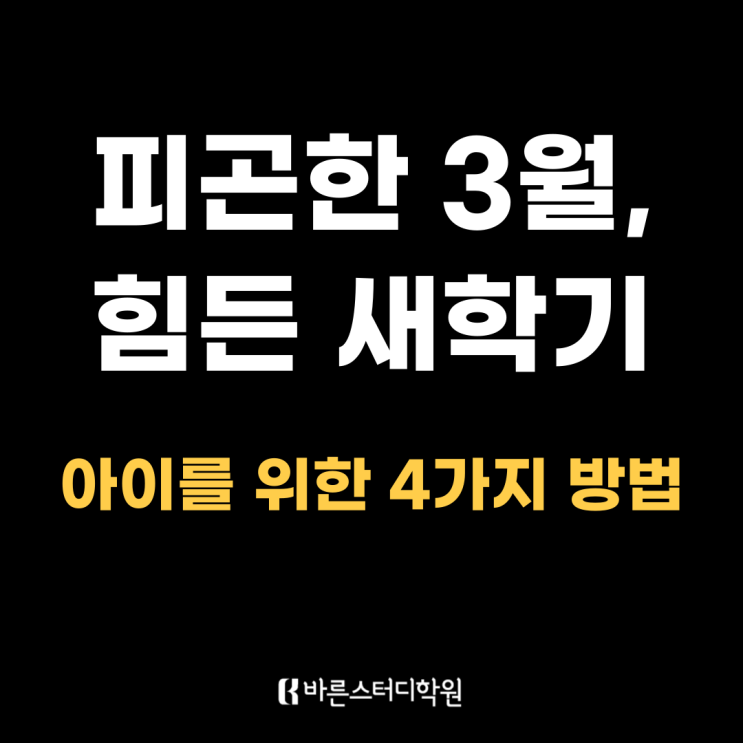 길고 긴 겨울방학이 끝나고 새학기가 시작된 요즘, 우리 아이들만큼이나 피로감을 느끼고 계신 부모님도 많으시지요. 일찍 일어나 학교에 가고, 새로운 환경에서 하루를 보내고, 집에 오면 숙제까지 해야 하니 아이들도 피곤할 수밖에 없습니다. 그래서 3월 새학기에는 평소보다 짜증이 늘거나 숙제를 시작하기까지 시간이 오래 걸리기도 하지요. 이런 모습을 보면 부모님 마음도 흔들립니다. “지금 너무 힘든 것 같은데 그냥 쉬게 해줘야 할까?” 하지만 지금 시기에 중요한 것은 완전히 쉬게 하는 것이 아니라 ‘부담은 줄이고 생활 리듬을 되찾는 것’ 입니다. 아이의 피곤함이 걱정된다고 공부를 잠시 멈춰버리면 방학 동안 흐트러졌던 생활....... <img src="https://blogthumb.pstatic.net/MjAyNjAzMTBfNjUg/MDAxNzczMTQ1NTIzMTAz.QidmYbYkmTh8qvlA4GrOIjBkqiO2cpmK3WqQAMX-664g.3OywwLBSelVOVWy3qqEjd3bon3bfiY56aFlVF0zj8k0g.PNG/001.png?type=s3" />