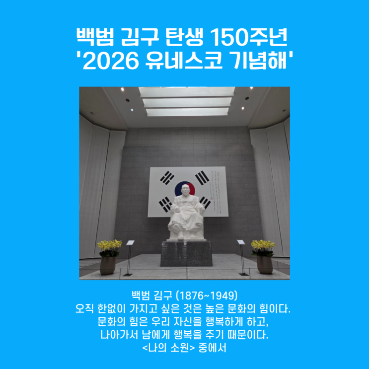 한우리 수업을 하고 있는 6학년들과 백범 김구 기념관에 다녀왔습니다. 백범 김구 기념관은 6호선 효창공원역 1번 출구에서 10~15분 정도 올라가면 있습니다. 3.1절 1주일 전이어서 더 의미 있는 시간이 되었습니다. 유네스코는 1957년부터 2년 단위로 회원국들로부터 역사적 사건이나 인물의 기념해를 제안받아 유네스코가 추구하는 가치와 일치하는 경우 세계기념 해로 지정하여 그 가치를 널리 전하고 있습니다. 1994년 서울 수도 지정 600주년, 1996년 한글 창제 및 반포 550주년, 2012년 다산 정약용 탄생 250주년, 2013년 『동의보감』 발간 400주년 2021년 김대건 신부 탄생 200주년에 이어 백범 김구 탄생 150주년이 유네스코가 선포한 세....... <img src="https://blogthumb.pstatic.net/MjAyNjAyMjJfMTIg/MDAxNzcxNzM4NzQxMDI0.vqSDLD1jYzd-TJ7GjG1nPWyXMeEcDDhH3-FG1OSGWSIg.G5FNfefkfF6k2YIv9d-vA5IGjDsJ5flaSvLXSlBDreMg.PNG/%B9%E9%B9%FC%B1%E8%B1%B8-001.png?type=s3" />