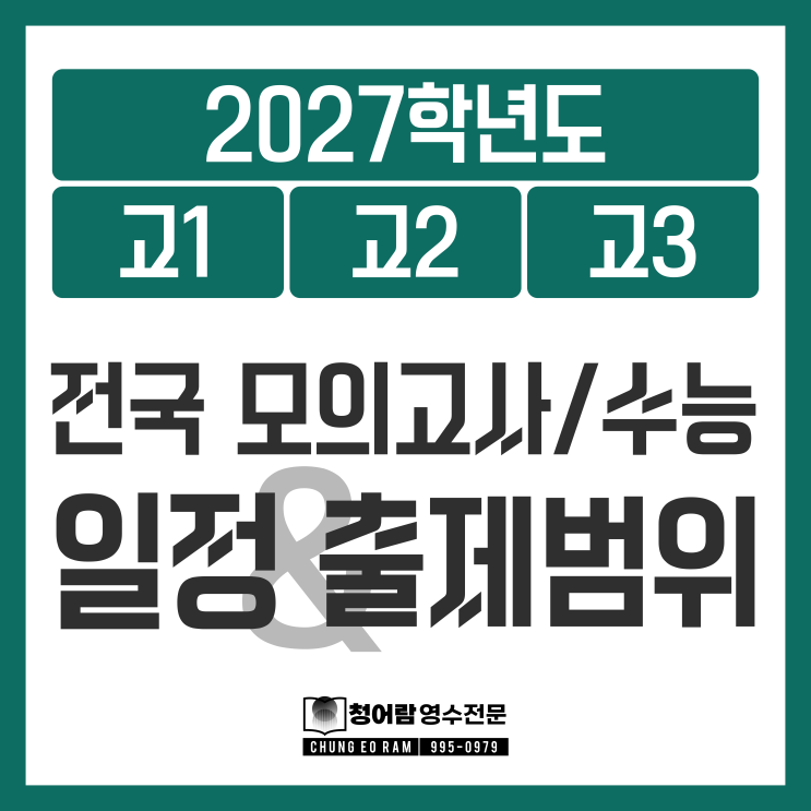 안녕하세요 청어람입니다:) 수많은 예비고1/고2/고3 여러분! 2026년, 즉 2027학년도 모의고사(전국연합고사)를 비롯하여 수능까지! 모든 일정을 한 눈에 비교해볼 수 있도록 알려드리겠습니다. 기존 9월 모의고사가 수시 원서 접수가 마감 후 성적통지되는 방식이었어서, 많은 수험생들이 객관적인 분석이 부족한 상태로 수시 지원을 하는 문제점이 있었습니다. 그래서 올해부턴 9모가 8월 넷째주 or 다섯째주에 시행된다는 이야기가 있었는데요. 현재 공지된 일정/출제범위는 사정에 따라 변동될 수 있으므로 우선 참고해주세요! 다음은 수학/영어 과목 출제범위입니다. 오늘은 이렇게 2027학년도 모의고사 일정과 출제범위에 대하여 알아보았습....... <img src="https://blogthumb.pstatic.net/MjAyNTEyMzBfMjQ1/MDAxNzY3MDg1MTA5OTE3._4IHaZfhaLKFXafc2icnSzaAk8iyQ-ZGQgpAaSFbfBYg.n6d9IT8HZa9QnfLenSdoFKEMz6lOzJUNIqpK4-30C-Qg.PNG/%C1%A6%B8%F1%C0%BB_%C0%D4%B7%C2%C7%D8%C1%D6%BC%BC%BF%E4._%282%29.png?type=s3" />