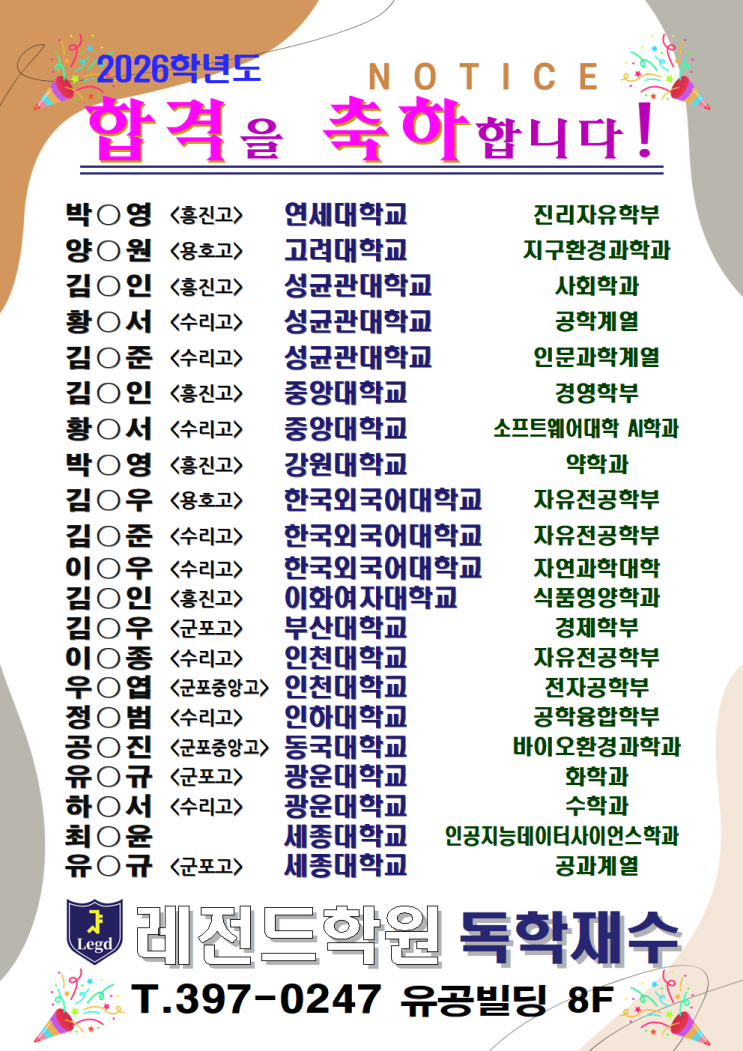[산본 독학 재수 학원] 2026학년도 대입 합격을 진심으로 축하합니다!