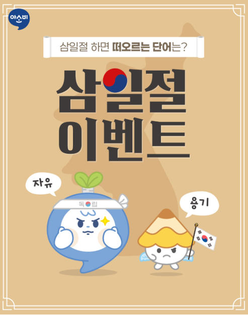 삼일절 이벤트 3월 1일은 3.1 운동을 기념하여 제정된 대한민국의 공휴일이자 국경일입니다! 여러분들은 삼일절 하면 어떤 단어가 떠오르시나요? 자유 / 용기 / 희망 / 기억 … 댓글로 적어주시면 추첨을 통해 선물을 드립니다. 삼일절의 의미를 되새기며 이벤트에 참여해 보세요 이벤트 기간 3월 3일 ~ 3월 31일 참여 방법 1. 아소비 이웃 추가 2. 댓글에 삼일절 하면 떠오르는 단어 적기 이벤트 경품 (총 20명) 올리브영 모바일 상품권 1만원 당첨자 발표 4월 3일 해당 게시물 및 비밀 댓글로 발표 당첨 TIP -이벤트 기간 내 블로그에 올라오는 게시물에 좋아요, 댓글 달면 당첨 확률 UP!☝☝ -댓글에 친....... <img src="https://blogthumb.pstatic.net/MjAyNjAzMDNfNDIg/MDAxNzcyNTExOTEwMDkw.w7jHE68qze0fF1xdxEKG9R0HAowglRMP-D7KbbnUVI8g.RV49lhsAuSAenbSXWb5p6v69e9PlRKnho3JPnm0rTbcg.PNG/image.png?type=s3" />