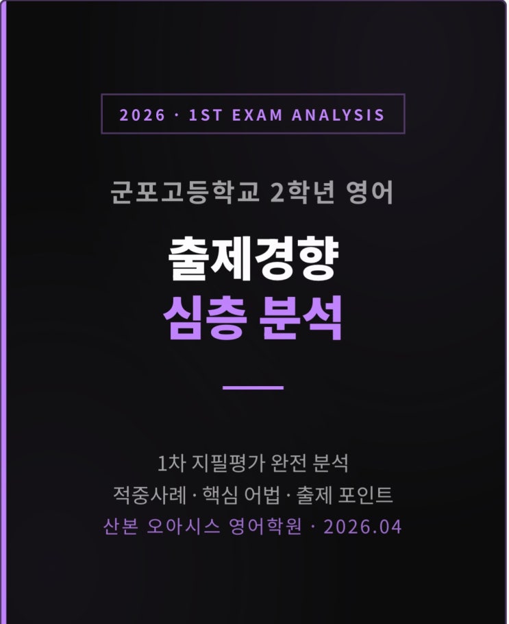 수리고 1학년 1학기 1차고사 영어 시험 분석 (2026) 안녕하세요. 와와학습코칭학원입니다. 이번 수리고 1학년 1학기 1차 영어 시험은 단순 암기형 시험이 아닌 독해 사고력 중심 시험으로 출제되었습니다. 시험의 구조와 출제 의도를 중심으로 전문적으로 분석해드립니다. 1. 전체 난이도 및 시험 특징 전체 난이도: 중상 변별력: 상위권 구분 가능 핵심 평가 요소 단순 해석 능력 ❌ 글의 구조 이해 + 논리적 독해 능력 ✔️ ✔ 특징 요약 문장 자체 난이도는 높지 않음 그러나 문장 간 연결과 글 전체 흐름 파악이 핵심 “읽는 것”보다 “이해하는 것”이 중요한 시험 2. 유형별 출제 구성 이번 시험은 다음과.......