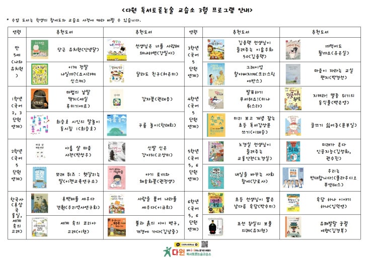 안녕하세요! 다원독서토론논술입니다. 새 학년 새 학기가 시작되는 3월이에요. 우리 어린이들 모두 새로운 교실과 선생님, 친구들을 만나며, 학교생활에 잘 적응하고 있겠지요? 항상 시작은 설렘과 함께 두려움을 느끼기도 하지만, 시작이 반이라는 말처럼 무언가를 시작하는 일에 두려움을 잘 흘려보낸다면 더 멋진 결과가 우리를 맞이하겠지요? 3월 수업 프로그램 안내입니다. 자세한 내용은 아래 사진을 참고하시고, 수업 문의는 카카오톡 1:1 채팅이나 전화로 연락해 주세요. 전화 : 031) 423-4778 카카오톡 1:1 채팅 : http://pf.kakao.com/_fByWd/chat <img src="https://blogthumb.pstatic.net/MjAyNjAzMDZfMjAz/MDAxNzcyNzg3MzQzMjQ5.0coPULN-vjE3rCXeXc1Hjvta_ccv0ow7McW0BP0Jzbwg.FC0frwVASPAl6KRkDkwo3VbKgW5zfLbh-wFU0TbMAt8g.JPEG/2026-03001.jpg?type=s3" />