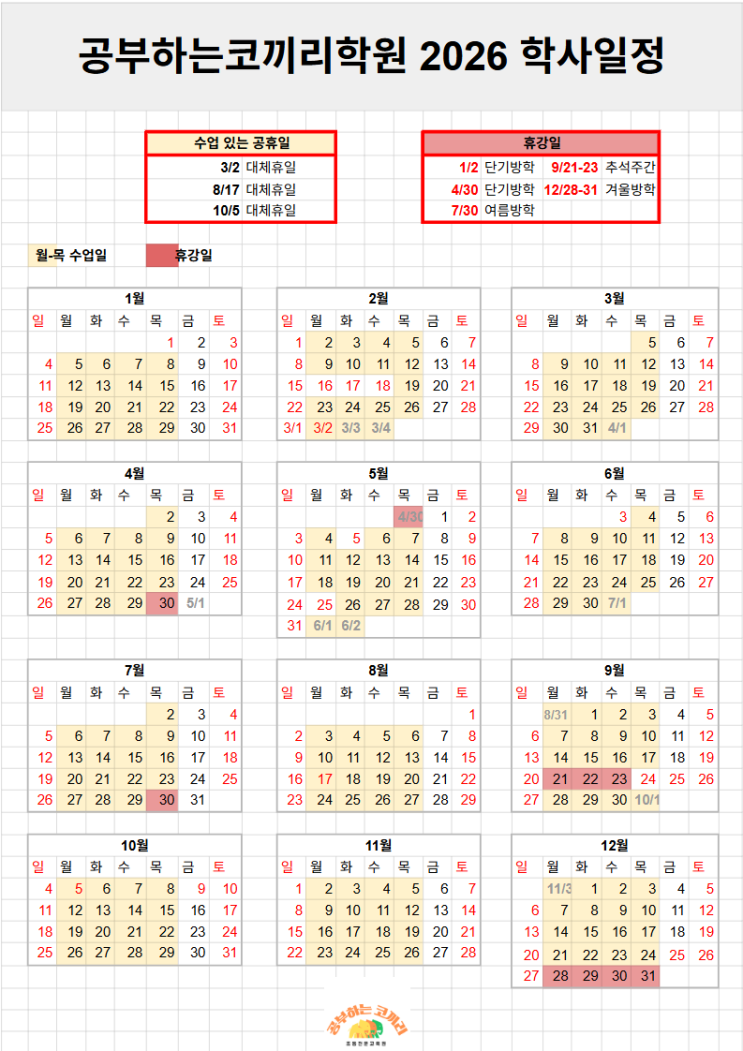 내손 초등 수학학원 공부하는코끼리학원 2026학년도 학사일정