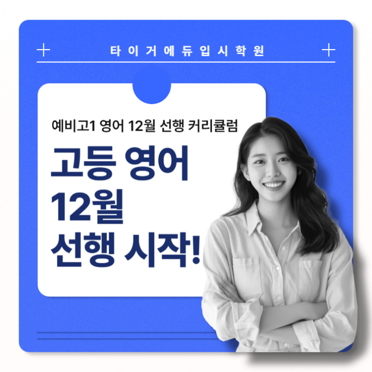 안녕하세요. 의왕 삼동 중·고등 내신·수능 전문 타이거에듀입시학원입니다. 중3 학생들은 이미 11월 기말고사를 마치고 이제 본격적인 예비고1 과정이 시작되는 12월, 고등 영어 대비를 어떻게 시작하느냐가 고1 1학기 성적을 좌우합니다. 특히 예비고1 단계에서는 학생별로 기본기가 서로 다르기 때문에, 타이거에듀는 누구나 안정적으로 고등 영어에 진입할 수 있도록 어휘–문법–구문–독해–작문을 자연스럽게 연결한 체계적인 커리큘럼을 준비했습니다. 1. 어휘 — “매일 쌓이는 기본 체력” 고등 영어는 결국 단어를 얼마나 꾸준히 축적했는가가 성적을 결정합니다. 그래서 12월부터는 ‘단기간 벼락치기’가 아닌 매일 30~60분 반복 노....... <img src="https://blogthumb.pstatic.net/MjAyNTEyMDVfMjI3/MDAxNzY0OTA5MTU0NTQ5.gtWPILcL1IZR-wx7CvuztAW5tBgrIKqNx0gvJDKh65Ag.cLyB-ba7S20iNKwGXu8Lafius89AVbnoudQNL8twR9og.PNG/002.png?type=s3" />