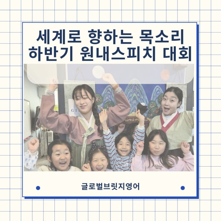 안녕하세요, 글로벌브릿지영어입니다. 지난 11월 27일, 뉴욕에서 열린 추수감사절 퍼레이드 (Macy's Thanksgiving Day Parade)에서 미국 전역에 K-Pop Demon Hunters 코스프레와 공연이 생중계되었다고 합니다. 이에 맞춰 저희 학원에서도 K-컬처를 주제로 한 **‘원내 스피치대회’**를 개최했습니다^^ 아이들은 한국 전통 문양 키링 만들기, K-컬처 퀴즈, 간식 나눔 등 다양한 활동을 즐기며 그동안 성실하게 공부해온 시간들을 축하하는 뜻깊은 하루를 보냈습니다. 한국 문화가 세계적으로 주목받고 있는 만큼, 그 어느때보다 우리 아이들이 자신 있게 말하고 표현하는 능력은 더욱 중요해지고 있습니다. 이번 행사에서는 CNN 앵커 도전....... <img src="https://blogthumb.pstatic.net/MjAyNTEyMDlfOTQg/MDAxNzY1MjUwMDIwMjkz.DdtuNHAdVhsvZpieYW8HQXxyfwm_iK9xZn2flFzUGCsg.84Ahpx8yKzsQ9CJL0-Pw7xz6R9hNWIb6OXJ1pmEQur0g.JPEG/11.jpg?type=s3" />