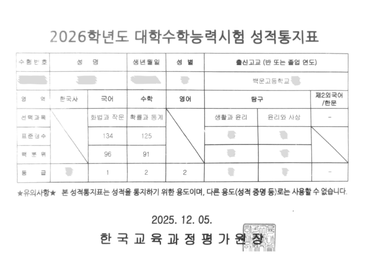26학년도 수능시험 성적표
