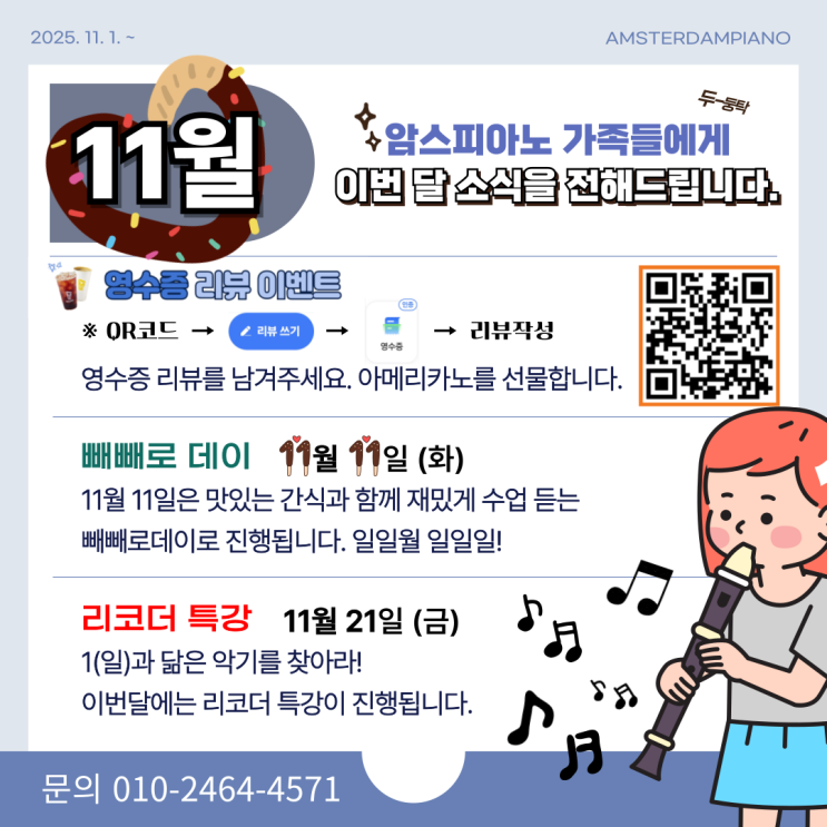 안녕하세요, 암스테르담 피아노 가족 여러분! 늦가을의 정취가 깊어가는 11월입니다. 아름다운 선율과 아이들의 밝은 웃음소리로 가득한 우리 학원의 11월 소식을 전해드립니다. 가을의 끝자락인 만큼, 학원에서는 우리 아이들이 음악과 더욱 친해지고 즐거움을 느낄 수 있도록 다채롭고 특별한 이벤트와 특강을 고민하며, 친구들과 소중한 추억을 만들 수 있는 곳이 되도록 노력하고 있답니다. 자 그러면 11월 소식 전해드릴게요.^^ 11월의 특별한 즐거움, 놓치지 마세요! 영수증 리뷰 이벤트: 소중한 의견을 나누고 아메리카노 받으세요! 우리 학원에 대한 솔직하고 따뜻한 후기는 암스테르담 피아노를 더욱 발전시키는 큰 힘이 됩니....... <img src="https://blogthumb.pstatic.net/MjAyNTExMzBfMjI2/MDAxNzY0NTA4NDc5OTc4.j9z46Xf7K2E3-hZ_qoPYQUP5uzBN1Kn1mC42y48Hw5gg.whVOHId8Jh2G-iEQvC4JxvcNmii_vN1pV6OF6MwOGPog.PNG/6%BF%F9-%B0%F8%C1%F6_%BA%B9%BB%E7%BA%BB-_1_-001_%283%29.png?type=s3" />