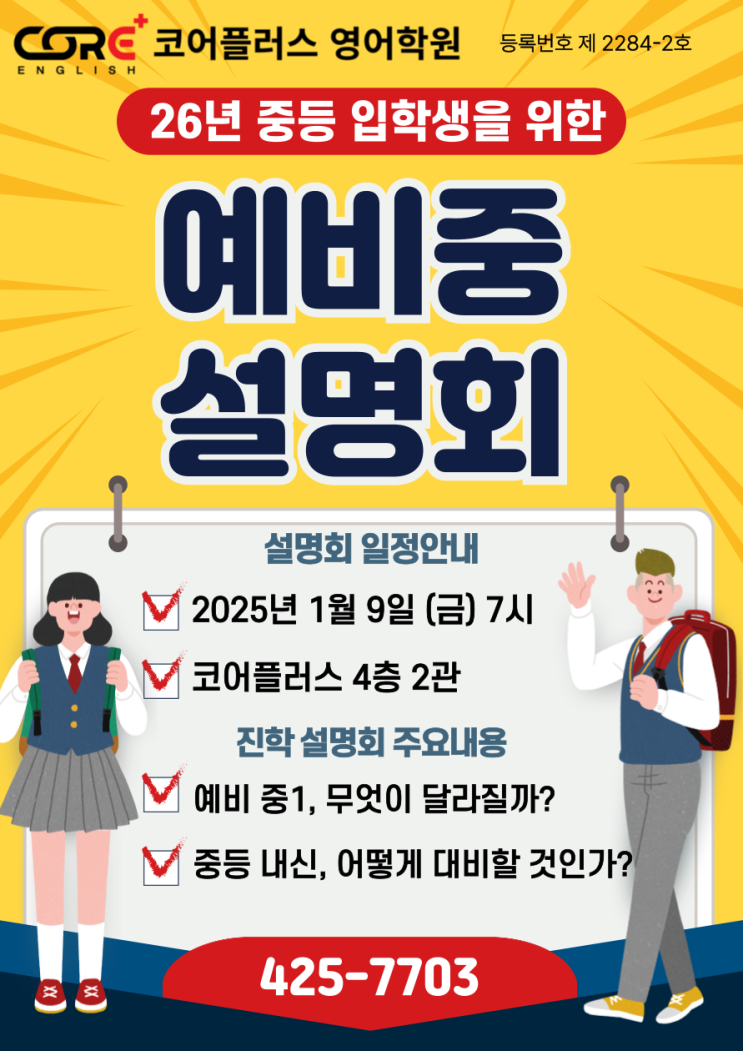 안녕하세요! 언제나 새로운 비전을 제시하는 코어플러스 영어학원입니다:) 다가오는 1월 9일 예비중을 위한 진학설명회가 개최 될 예정입니다! 중학교 영어의 차이를 아시면 지금 그 학원 계속 다니면 안됩니다. 고등영어를 아는 선생님이 중등영어의 맥락도 잘 이끌어 주십니다. 전체학생중 30~40%가 영어에서 A를 획득하고, 영어 평균이 70점에서 높게는 80점대까지 오르내리는 중학 영어의 환상에서 벗어나야 고등 영어를 제대로 준비할 수 있습니다. 입시의 신은 내신이라는 말이 있습니다. 내신 잘하는 학원이 다 잘합니다. 입소문으로 알고 계시는 그 학원 직접 방문하시고 1:1 진학상담 기회를 잡으세요. ◎ 설명회 대상: 현중3(26년 예비....... <img src="https://blogthumb.pstatic.net/MjAyNTEyMDhfMjcx/MDAxNzY1MTkwMTIzMzE2.Co78uVdIESPIoOu4Iniz3U5q-zrIS3OW980anzeUr40g.QHuHVJBaTTFUxQDOz382CAqycFwgqnCNWMmdDxAdPu0g.PNG/%BF%B9%BA%F1%C1%DF%B5%EE-%C0%D4%BD%C3%BC%B3%B8%ED%C8%B8-002_%282%29.png?type=s3" />
