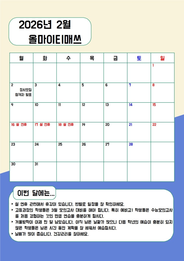 벌써 윈터스쿨9기를 진행하면서 하기 싫은데도 꾹 참고 열심히 하고 있는 여러분들을 보며 문득 힘든데도 왜이렇게 늘 자리는 순식간에 마감이 되고 투덜투덜하면서도 막상오면 열심히들 하는지 신기하기도 하고 기특하기도 해서.. 윈터스쿨을 왜 해야하는지 chat gpt에게도 한번 물어보았어요. 윈터스쿨을 하는 이유는 한마디로 **“방학을 그냥 흘려보내지 않기 위해서”**예요. 조금 풀어서 말하면 학습 공백 줄이기 겨울방학이 길다 보니 공부 리듬이 완전히 깨지기 쉬워요. 윈터스쿨은 최소한의 공부 감각을 유지하게 해줘요. 기초 보강 & 선행 학습 1년 동안 놓친 부분을 정리하거나, 새 학년 내용을 미리 맛보는 데 딱 좋아요. 특....... <img src="https://blogthumb.pstatic.net/MjAyNjAxMjRfNTYg/MDAxNzY5MjUwNjY5NDU4.HGyuzNQYtuzkSDkzDIuSyO4MIhYcVPtIHnKRVR91OGgg.3Tbv8GAx6IuKRLt5z0Z0bhybPsIATxczSibOmzDrBwUg.PNG/%C1%A6%B8%F1%C0%BB-%C0%D4%B7%C2%C7%D8%C1%D6%BC%BC%BF%E4_-001_%2833%29.png?type=s3" />