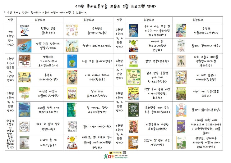 안녕하세요! 다원 독서토론논술입니다. 새하얀 눈이 반기는 2월이에요. 우리 어린이들은 신나게 방학을 즐기고 있겠지요? 계속되는 추운 날씨에 건강도 잘 챙기며, 신나는 겨울방학을 마음껏 즐기면 좋겠어요. 2월 수업 프로그램 안내입니다. 자세한 내용은 아래 사진을 참고하시고, 수업 문의는 전화나 카카오톡으로 연락해 주세요! 전화 : 031) 423-4778 카카오톡 1:1 채팅 : http://pf.kakao.com/_fByWd/chat <img src="https://blogthumb.pstatic.net/MjAyNjAyMDJfMTM4/MDAxNzcwMDI0MDUyMzQz.hhXMkxlt5UnZ6wltyanFEwfmIiY-tYp62apPgnu1F4wg.Lj8miyRgTN_0yGMGQvTB00tB_0897Kfy0O5kEO_8P9wg.JPEG/2026-02001.jpg?type=s3" />