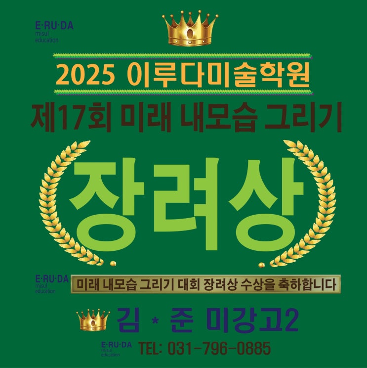 대회 주요 내용 알아보기 대회명: 제17회 미래내모습 그리기 대회 주제: 그림 속에 담긴 미래의 나 총 292점의 작품에 상금 1,910만원이 수여 대상, 교육부 장관상, 서울특별시장상 등 총 16점이 특별히 시상 이루다미술학원 고등부 부분에서 장려상을 수상하였습니다. 축하합니다.^0^~~ 내일의 꿈을 위해 한발 더 성장해나가는 이루다미술학원 고등부 친구들 언제나 화이팅 응원합니다.^0^ 상담문의 031-796-0885 <img src="https://blogthumb.pstatic.net/MjAyNjAyMjdfMTIw/MDAxNzcyMTk0MTI0MjAx.nAFMF67-SzQ9fLU_2h-Km1eHn0f6aXW3iIA-aD5vo2gg.LskpTB6sLuCFgWIGM3hKbo850cyIQOf-ve-TYNZ_DJsg.JPEG/%B1%E8%B5%BF%C1%D8-%BC%F6%BB%F32025.jpg?type=s3" />
