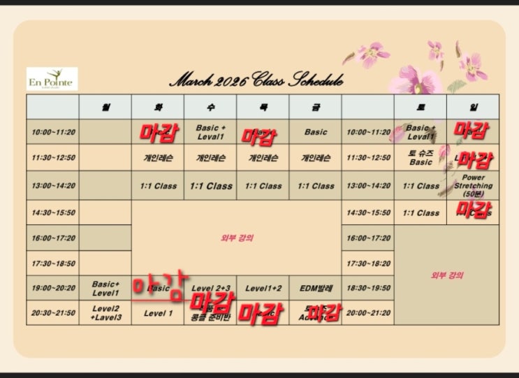 3월 마감된 반 확인부탁드립니다. 매달 Enpointeballestudio를 찾아주시고 열정적으로 수업에 참여해주시는 Enpointballet 발레리나분들 너무 감사드려요~ Enpointeballestudio 에서 어렸을때의 이루지 못 한 희망을 이루어 드리려 합니다!!! 무용학과 발레전공 편입학 상담을 받습니다. 콩클 및 무대경험을 쌓아가며 무용과 편입학어 도전해 보세요!!! 화이팅!! 앙포인트발레스튜디오에서는 매달 10일부터 20일까지 기존 회원분들의 재등록을 우선으로 받고 21일부터 말일까지 신규 등록을 받습니다. Tel: 010 3399 1739 카톡아이디: enpointeballet 하남 최초 성인 전문 발레 스튜디오!! 앙포인트발레스튜디오 경기도 하남시 미사강변동로 127 ....... <img src="https://blogthumb.pstatic.net/MjAyNjAyMjhfMjI5/MDAxNzcyMjg0MzE1NDA3.dJy6KQF3AdtWphN4v17SjeLbwAUkPpw1PCk81Ji0pM4g.N5ClSwa7Qw7ha3B211XwozahWaxLGpgV5oxi9GluEi4g.JPEG/900%A3%DF1770684155084.jpg?type=s3" />