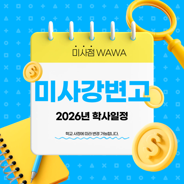 안녕하세요! 2026년 하남 미사강변고등학교 학사일정 안내드립니다. 2026년 하남 미사강변고등학교 학사일정 1학기 2026년 하남 미사강변고등학교 학사일정 2학기 학년별 반별 시간표 내 삶의 주인공이 되는 청소년의 첫걸음!!! 스스로 자기주도학습력을 기르기입니다. 플래너와 과목별 수업 프로세스를 통해 wawa 미사점과 함께 성장해보아요. 가장 궁금해하실 학원 프로세스들을 아래 포스팅으로연결해놨습니다 [원장 인사말] https://m.blog.naver.com/kp73001/222948231660 [강사소개] https://naver.me/xPpAzsf0 [학원소개] https://naver.me/FsR2Mxty [수업관리예시] https://naver.me/FVB89Jaf [수강료 안내] https://m.blog.naver.com/kp....... <img src="https://blogthumb.pstatic.net/MjAyNjAzMDVfMTEw/MDAxNzcyNzAzOTgzMTA2.tThi-gwLZIau1HBsIK1sbH_rUOWMHPQE62T8jZGkjOEg.OfeZ3I-Ddtm7A9J3lJN5QuHnESnV6dGtOnfr_3oFqZsg.PNG/%C1%A6%B8%F1%C0%BB_%C0%D4%B7%C2%C7%D8%C1%D6%BC%BC%BF%E4._%2825%29.png?type=s3" />