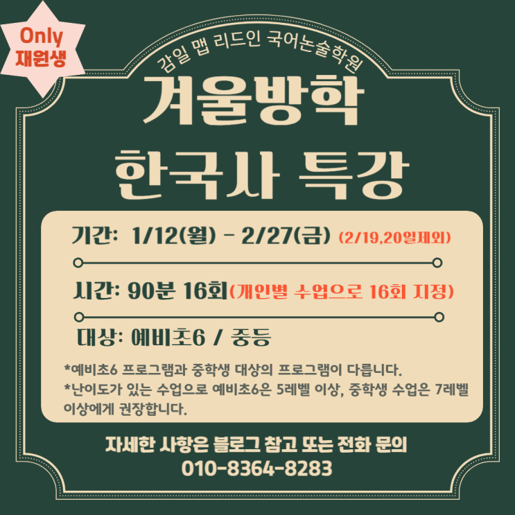 안녕하세요? 2026 겨울방학 특강으로 준비한 한국사 특강 소개합니다. 정규 수업을 듣고 있는 재원생에게 제공되는 특강입니다. 우선 이번 한국사 수업은 강사의 판서를 통해 일방적으로 주입하는 강의식 수업이 아님을 말씀드립니다. 저희 리드인은 독서를 기반으로 하고 자기주도학습으로 완성되는 프로그램입니다. 자기주도로 이루어지는 한국사 수업이고, 강사의 코칭에 의해 학생 스스로가 프로그램을 이용해 학습하는 형태입니다. --------------------- 1. 초등한국사 (두근두근 한국사) 대상: 5레벨 이상의 예비초6 시간: 개인별 수업으로 16회 지정 기간: 2026년 1월 12일 - 2월 28일(6주) 수업시간: 90분 특강비: 16회 380,000원 ->....... <img src="https://blogthumb.pstatic.net/MjAyNTExMjhfMTA2/MDAxNzY0MzIwMDY3MDEy.096cpdAegQ2z0Qf7jtsr7WV5FV4bqwlixOzJHlrLDdgg.rs8cTHULdGGOyol8Ie2rBYNmJW9oYOYwGA70du6Xh_Mg.PNG/%B5%B6%BC%AD%C6%AF%B0%AD-001_%281%29.png?type=s3" />