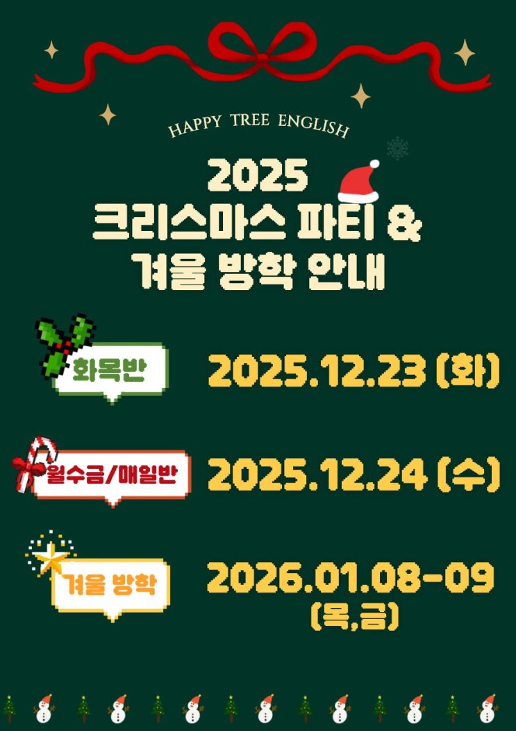 크리스마스 파티 & 겨울방학 안내 한 해 동안 열심히 달려온 우리 해피트리 아이들! 2025년을 마무리하는 이 시점에서, 한 해 동안 쌓였던 학업 스트레스를 잠시 내려놓고, 서로 웃고 즐기며 에너지를 충전하는 시간을 마련했습니다. 크리스마스 파티 일정 12. 23. 화 (화·목반) 12.24.수 (매일반 · 월수금반) 12. 25(목) : 휴원 아이들이 가장 기대하는 날! 반별로 준비된 이벤트와 활동으로 따뜻하고 행복한 크리스마스 분위기를 함께 나누려고 합니다. 겨울방학 안내 1. 8(목) ~ 1.9(금) (2일간) 짧지만 꼭 필요한 재충전의 시간! 아이들이 몸과 마음을 쉬게 하고, 2026년 새로운 학년을 건강하게 맞이할 수 있도록 준비하는 기....... <img src="https://blogthumb.pstatic.net/MjAyNTEyMDlfMzgg/MDAxNzY1MjYzNTIyNzAz.JIwPKWmgyhKr1c1zwNebuQaw7dpWs_YVs7hIe8nO2EYg.QYTYtaLjg2SBJStN08Tugsz66Kugo5-dNBD_4GIWfpkg.JPEG/1.jpg?type=s3" />
