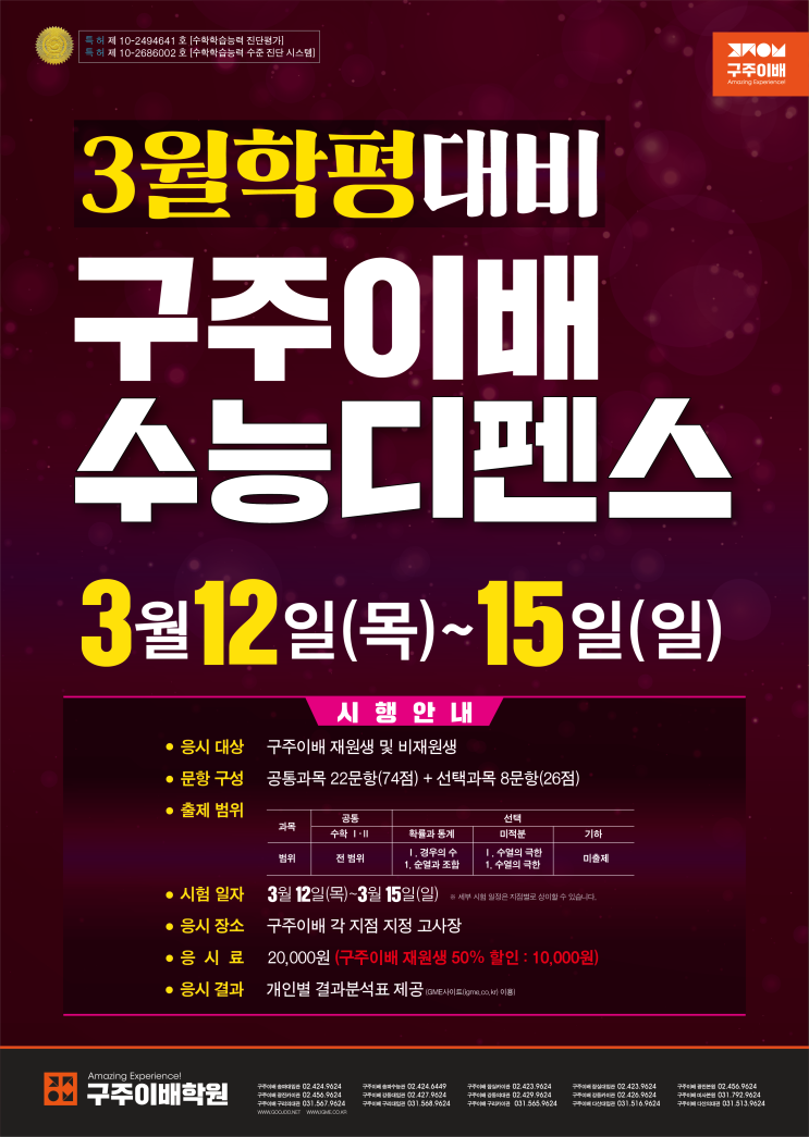 실전과 같은 준비, 수능디펜스 구주이배 미사본원 안녕하세요? 구주이배 미사본원입니다. 2026년 3월 학평대비! 구주이배 수능디펜스가 실시됩니다. 수능디펜스는 실전에 대비한 최신 트렌드의 모의고사로 개인별 결과 분석표를 제공하며, 이에 따른 등급 예측 및 약점 보완이 가능합니다. 구주이배 미사본원에서 수능디펜스로 미리 준비해서 좋은 결과 있기를 바랍니다! < 시행안내 > 응시대상 : 고3 수험생(※비재원생 응시가능) 시험일시 : 3월 12일(목) ~ 15일(일) 시험장소 : 구주이배 미사본원 3층 고사장 응 시 료 : 비재원생 20,000원, 재원생 10,000원(50% 할인 적용) 시험과목 : 수학영역_공통+선택(기하 제외) 소요시간 : 100분....... <img src="https://blogthumb.pstatic.net/MjAyNjAzMDVfMjI3/MDAxNzcyNjkyMDc3Mzg2.GYjNrXY0RJaE5h7o5ohzFfWak-nBTwFb98ZW3MfYwbcg.BDCmCVEgWDmBipnksJ5avRMwfc_QwGl39SYv9rGJ2Ywg.PNG/%BC%F6%B4%C9%B5%F0%C6%E6%BD%BA.png?type=s3" />