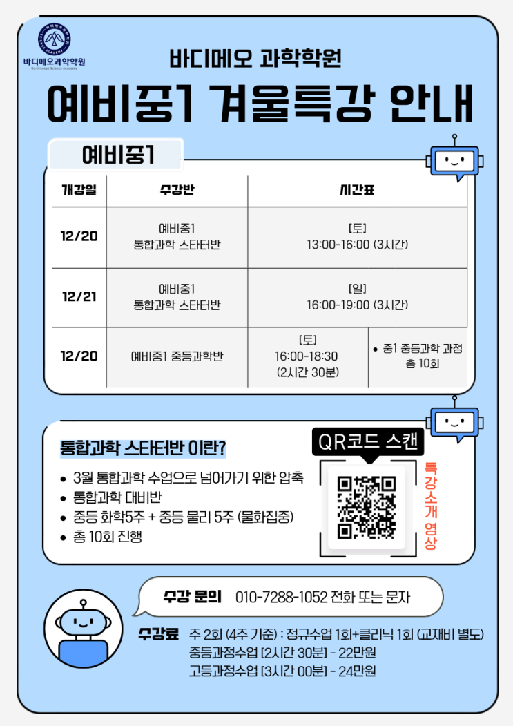 [학원 상담 및 문의 안내] 내신 준비, 바디메오 과학학원과 함께라면 걱정 없습니다. 학원 연락처 : 010-7288-1052 상담 가능 시간 : 평일 14:00 ~ 22:00 / 주말 09:00 ~ 22:00 <img src="https://blogthumb.pstatic.net/MjAyNTExMjBfMjA5/MDAxNzYzNjMxNjg1MzIw.8uqucNRKMEBVMdGsmzUgACjhFm1nmhhViDNlcurOOAgg.FkboHhUD8MvqHfGRp3KR-cfFCTGPnwHyuysB8HoPjSQg.PNG/1-예비중1.png?type=s3" />