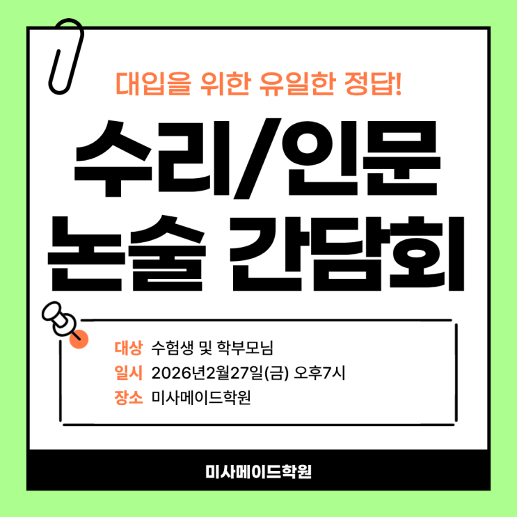 2027 대입 논술전형 어떤 학생이 합격 할까요? 안녕하세요. 미사에서 가장 전문적인 논술학원 미사메이드학원입니다. 오늘은 27년 대입을 위한 수리논술과 인문논술 간담회에 대해 안내해드리겠습니다. 설명회 주제 -2027 대입 전형 (논술대상과 논술전형) -논술 합격의 비법 및 합격의 전략 -논술의 대비방법 2026년 2월 27일 금요일 오후 7시 - 논술이 정확히 어떤 시험인지 감이 안 잡히는 분 - 논술준비 언제부터 준비해야 하는지 막막한 분 - 정시·수시 전략 속에서 논술의 역할이 궁금한 분 - 논술을 시작해야 할지 아직 결정하지 못한 분 수리논술: 수학 실력을 합격으로 바꾸는 역전의 기술 이승만T • 고려대 공과대학 졸업 • 대치메이....... <img src="https://blogthumb.pstatic.net/MjAyNjAyMjJfMjUg/MDAxNzcxNzM4Nzk5NDc5.hO61b52YlI1mdE9SciLbBckyYjlzc5tcgFRH1MBw3oIg.rX15vU11cZQJFGziCJzwyuDyCtCQn-jQoiYM0230t5Mg.PNG/1.png?type=s3" />