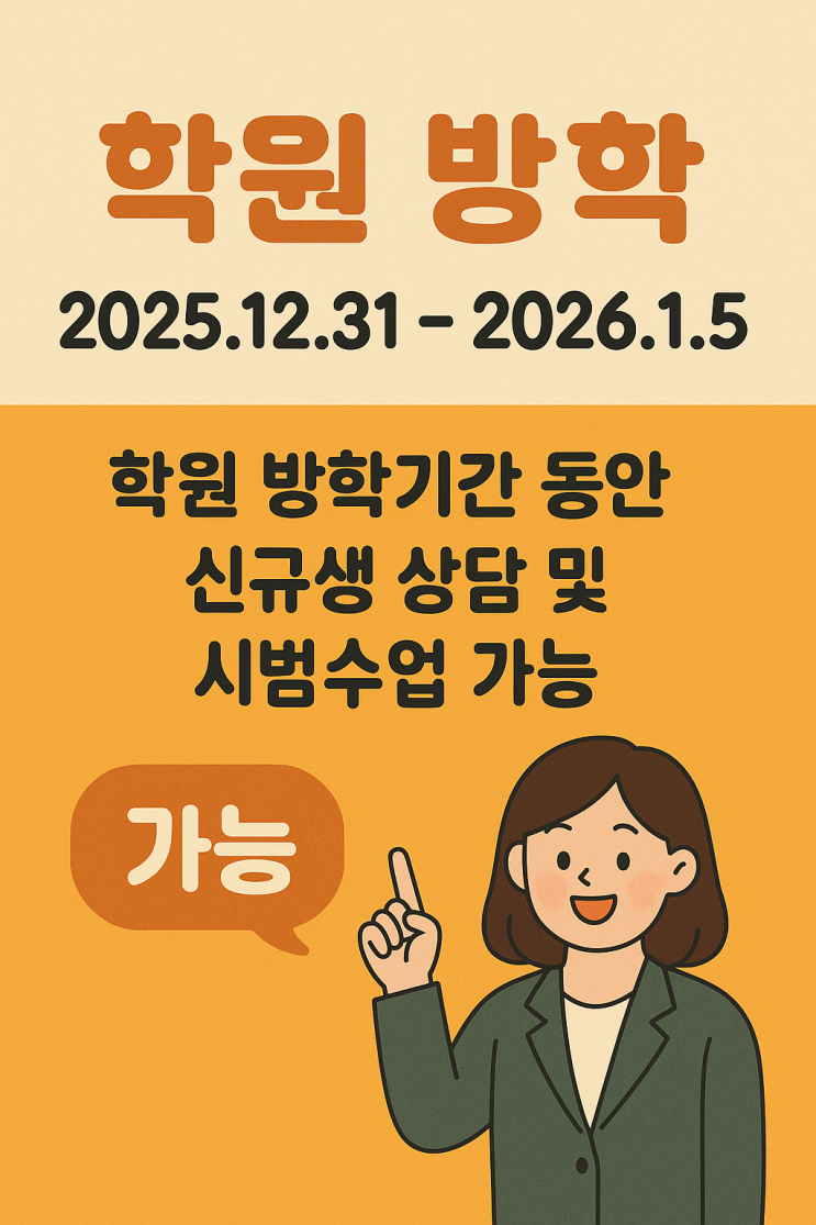 안녕하세요! 벌써 11월의 마지막주라니 시간이 무척 빠르네요 ㅠㅠ 오늘은! 저희 BOSS학원에서 다가오는 겨울방학을 맞이하여 겨울방학 수업 안내를 해드리려고 해요! 12월이 가까워 진 만큼 학생들도 보스학원 원장님들과 선생님들도 시험 대비와 방학 대비를 위해 바쁘게 일하고 있답니다. 저희 BOSS학원의 겨울방학은 2025년의 마지막날인 12월 31일부터 2026년 1월 5일까지이며 주7일을 수업(!)을 자랑하는 스학원답게 학원 방학중에도 신규생 상담과 시범수업 예약이 가능합니다! 저희 BOSS학원은 국어, 영어, 수학 과목별 완벽하게 학생 개별 이해에 맞춘 1:1 수업 방식을 원칙으로 하며, 상담을 예약해주시면 먼저 정규 수업과 동일....... <img src="https://blogthumb.pstatic.net/MjAyNTExMjRfOTgg/MDAxNzYzOTYyMjc4ODUw.eNWirxkVW2X4chA1hJ6dQ734FyIDEydKQIfNqJ-cJNEg.ENhfC4A0jYAxyYYI5Wobse3Dz9S8h7yByUH8absLZxkg.PNG/736f4f70-2d41-41d1-b51c-d1f5f76f94f6.png?type=s3" />