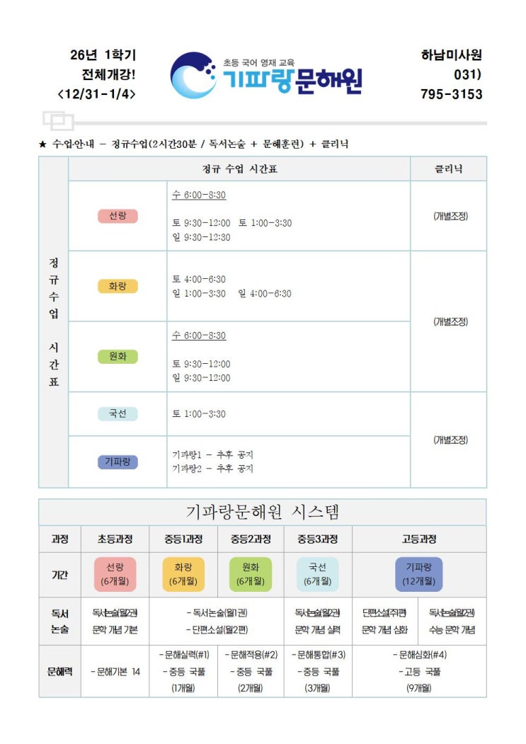 2026 기파랑문해원 하남미사원 원생 모집 안내 기파랑문해원 하남미사원, 2026 원생 모집 안내를 아래와 같이 드립니다. 감사합니다! - 개강일 : 2025년 12월 31일(수)-1월 4일(일) - 테스트 : 현재 10월 입학 테스트 진행 중(12.10(수)부터는 12월 입학 테스트 진행) - 레벨구성 : 선랑 > 화랑 > 원화 > 국선 > 기파랑 - 학습내용 : 독서논술 + 문해훈련(비문학) - 수업시간 : 아래 수업 시간표 참조 - 등록/접수 : 12.03(수)부터 접수 중 - 입학 테스트 결과 취득점수에 따라 레벨별 등록 가능 - 테스트 신청하기 : https://misa.kiparang.co.kr - 문의 : 031-795-3153 <img src="https://blogthumb.pstatic.net/MjAyNTEyMDRfMjUz/MDAxNzY0ODI5MDgyNTg3.Prz6xQGgfwcotY9zWseiMKrb2s21B8srTzCtBNYwkMYg.YzbJa-1lQ_5duXU3PUG45EwkJFsVtNd7HfDEPgFoPoog.JPEG/2026%B3%E2_1%C7%D0%B1%E2_%B1%E2%C6%C4%B6%FB%B9%AE%C7%D8%BF%F8_%C7%CF%B3%B2%B9%CC%BB%E7%BF%F8_%BD%C3%B0%A3%C7%A5_%C7%A5%C1%D8%BD%C3%B0%A3%C7%A52_%C8%A8%C7%C7%BF%EB001.jpg?type=s3" />