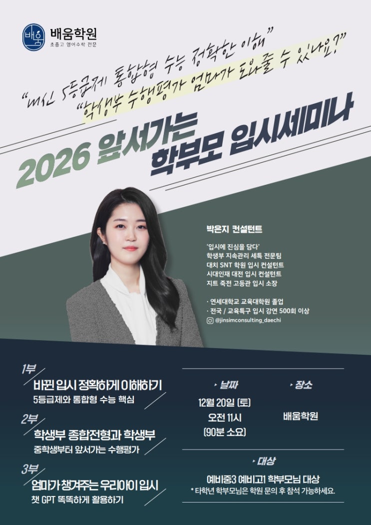 안녕하세요~ 영수전문 배움학원 입니다. 학생부 수행평가 엄마가 도와줄 수 있나요? 입시는 전략이다! 고교학점제 시대 반드시 알아야 할 입시 노하우!! 내신 5등급제 통합형 수능의 정확한 이해를 도와 드립니다. 5등급제 시대! 생기부가 더 중요해진 이유입니다. 입시 세미나 세부 내용 1부 바뀐 입시 정확하게 이해하기 - 5등급제와 통합형 수능 핵심 2부 학생부 종합전형과 학생부 - 중학생부터 앞서가는 수행 평가 3부 엄마가 챙겨주는 우리 아이 입시 - 챗GPT 똑똑하게 활용하기 올해부터 시작된 고교학점제가 교육제도의 목표와 평가가 불일치 하면서 어떤 방향으로 흘러갈지 학부모, 학생 심지어 교사들 조차도 방향을 제....... <img src="https://blogthumb.pstatic.net/MjAyNTEyMDRfODQg/MDAxNzY0ODQzNjA4NDcy.DluSObybhHnHP_25iA4yz2ndcJZreNMh8hlVPIkACYwg.oZglYuxzHIBLA5g57EVF4_TPDB9KfaXY5IxxCBz96JIg.JPEG/%C6%F7%BD%BA%C5%CD_%B9%E8%BF%F2%C7%D0%BF%F8_2026_%BE%D5%BC%AD%B0%A1%B4%C2_%C7%D0%BA%CE%B8%F0_%C0%D4%BD%C3%BC%BC%B9%CC%B3%AA3-%BA%B9%BB%E7_1.jpg?type=s3" />