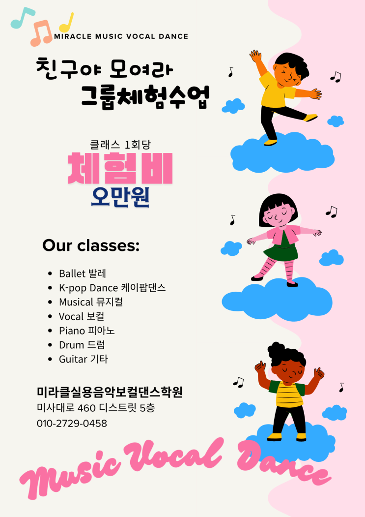 친구들, 모이면 어디 가요? 다른 데 가지 말고! 체험하면서 배우는 미라클로 오세요! 친구끼리 · 가족끼리 · 선후배끼리 모두 환영! 아이들과 부모님이 함께 즐길 수 있는 미라클 그룹체험수업이 진행됩니다 함께 오면 더 신나고, 더 즐겁고, 배움의 속도도 두 배! 클래스 1회당 체험비 오만원(₩50,000) 다양한 수업을 부담 없이 체험할 수 있는 특별한 기회! Our Classes 아이들의 재능을 깨우는 다양하고 전문적인 커리큘럼! Ballet 발레 K-pop Dance 케이팝댄스 Musical 뮤지컬 Vocal 보컬 Piano 피아노 Drum 드럼 Guitar 기타 음악·댄스·악기를 한 곳에서 모두 경험할 수 있는....... <img src="https://blogthumb.pstatic.net/MjAyNTEyMDVfMjg3/MDAxNzY0ODY0ODc3NzM5.MACMPO7hDnFRMC3AgNxpE4bEFxJX-Hn8rsvOOfGL7OUg.DsD5rlS5SLKT-d_rlBUaqUPMIcWyTVltcZ-hmOFiTuwg.PNG/%B1%D7%B7%EC%C3%BC%C7%E8%BC%F6%BE%F7.png?type=s3" />