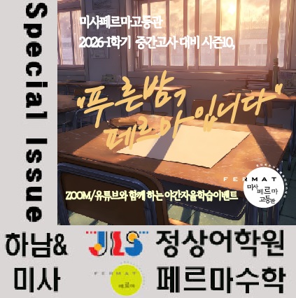안녕하세요 하남미사 고등학생들을 위해 최선을 다하는 대입수학전문학원 미사페르마고등관입니다. 2026년 1학기 중간고사를 대비하며 시즌10 "푸른밤, 페르마입니다" 재원생을 대상으로 야간자율학습이벤트가 진행됩니다. 각반 담당선생님들이 ZOOM 링크를 개설하고 페르[재원생애칭]들의 각 반 단톡방을 통해 링크가 제공되고 접속하여 온라인으로 학습이 진행됩니다. 집, 스터디카페, 독서실 등등 공부를 할 수 있는 곳 어디에서 핸드폰, 노트북, 태블릿 무엇으로든 자신의 학습모습을 담아낼 수만 있다면! OK! 2026년 첫 내신시험을 맞이하여 선생님과 친구들과 함께 혼자 힘들 수 있는 밤공부를 같이 응원받는 밤공부로~ 한정된 시....... <img src="https://blogthumb.pstatic.net/MjAyNjAzMjZfMjkw/MDAxNzc0NTEzNzc3NzIx.81PCX1zXiqLWk5TrIBmv5qc6_uDEJdbByCmB-bqnqPwg.sGGNjYlkpOHYZSyPQXLAUxTLAud5jf5QvBA_N1Iu-WQg.JPEG/229.2026-%BD%C3%C1%F010%C7%AA%B8%A5%B9%E3%28%BA%ED%B7%CE%B1%D7%29.jpg?type=s3" />