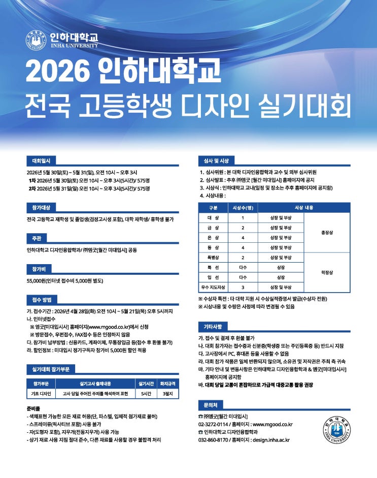2026 인하대학교 전국 고등학생 디자인 실기대회 인하대학교에서는 디자인 분야에 관심을 갖고 있는 전국의 우수한 대입 지망생들에게 자신의 실력을 발휘할 수 있는 기회를 제공하며 차세대 디자이너 발굴 및 지원 육성을 통한 인재양성에 기여하고자 본 디자인 실기대회를 개최합니다. ■ 대회일시 : 2026년 5월 30일(토) ~ 5월 31(일), 오전 10시~오후 3시 · 1차 : 2026년 5월 30일(토) 오전 10시 ~ 오후 3시(5시간) / 575명 · 2차 : 2026년 5월 31일(일) 오전 10시 ~ 오후 3시(5시간) / 575명 ■ 대회장소 : 인하대학교 60주년 기념관 ■ 참가대상 : 전국고등학교 재학생 및 졸업생(검정고시생 포함) , 대학 재학생/휴학생 불가 ■ 주 최 : 인....... <img src="https://blogthumb.pstatic.net/MjAyNjAzMjdfNDgg/MDAxNzc0NTk0Mjk3MzEw.L0wps3vQ3_0qPNu2cGOMwMBf5RqiG6VqK_F5pUvrjNUg.te4b1M-zEHsFeNIcgE3_fmZ0ThR3dtyXkIZpe3oW_zIg.JPEG/2026_%C0%CE%C7%CF%B4%EB%C7%D0%B1%B3_%C0%FC%B1%B9_%B0%ED%B5%EE%C7%D0%BB%FD_%B5%F0%C0%DA%C0%CE_%BD%C7%B1%E2%B4%EB%C8%B8_%C6%F7%BD%BA%C5%CD.jpg?type=s3" />